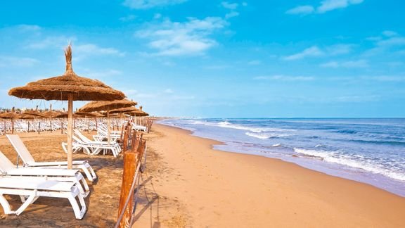 Melia Beach, hotelowa, piaszczysta, łagodne zejście do morza, ok. 300 m od hotelu, dojście przez teren hotelu i przejście przez deptak, bezpłatne parasole, leżaki, materace, ręczniki za kaucją (depozyt: ok. 100 MAD).