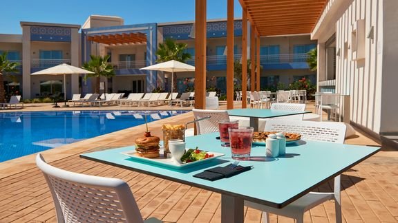 śniadanie (07.00-10.30), obiad (12.30-15.00), kolacja (19.00-22.00) w formie bufetu w restauracji; przekąski w barze przy basenie (10.30-12.30, 15.00-18.00); napoje bezalkoholowe i lokalne napoje alkoholowe w barze w lobby (10.00-01.00) lub w barze przy basenie (10.00-20.00); wymagane noszenie opasek all inclusive.