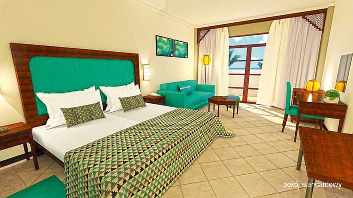 standardowy: 2-os. (możliwość 1 dostawki dla os. dorosłej lub 2 dzieci – sofa), indywidualnie sterowana klimatyzacja, (prysznic, wc; suszarka), internet bezprzewodowy, telewizja satelitarna, telefon, sejf, minibar (na powitanie: butelka wody), zestaw do kawy/herbaty; bezpłatne łóżeczko dla dziecka do 2 lat na zamówienie przed przyjazdem; balkon (stolik i krzesełka); widok na pole golfowe, ogród lub morze za dopłatą.