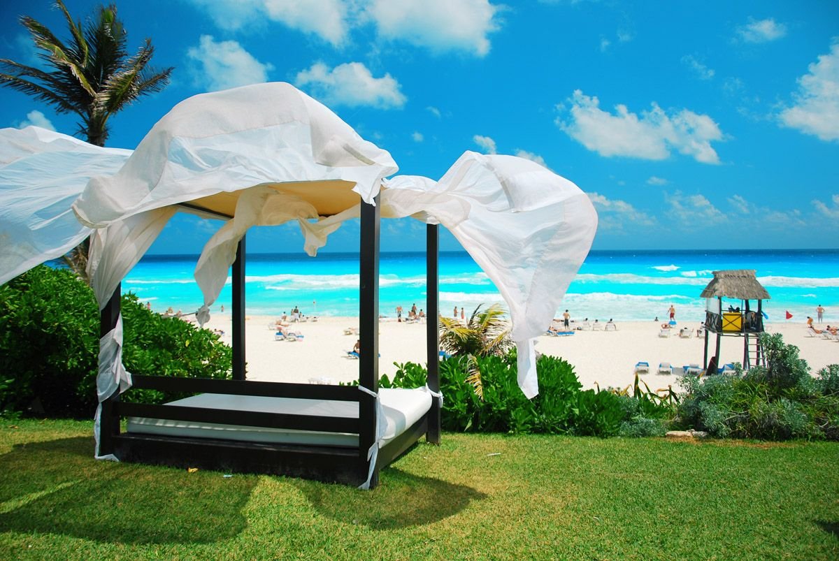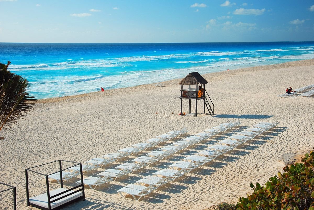 hotelowa, piaszczysta, ok. 600 m długości, łagodne zejście do morza, bezpośrednio przy hotelu, bezpłatne parasole, leżaki, materace i ręczniki, bar; klienci Grand Oasis Cancun mają dostęp do wydzielonej części plaży (Grand Oasis Exclusive Beach).