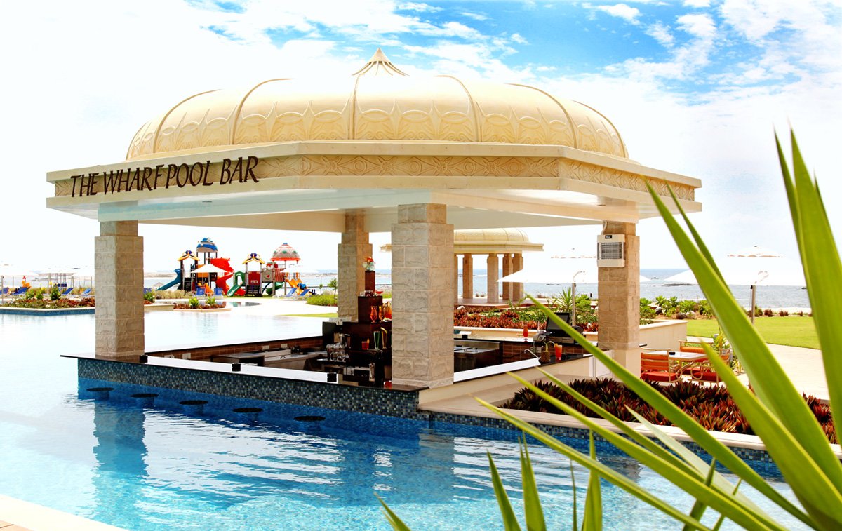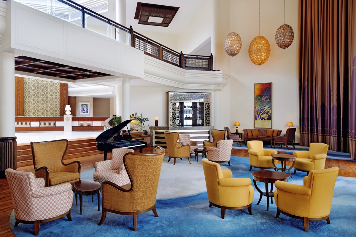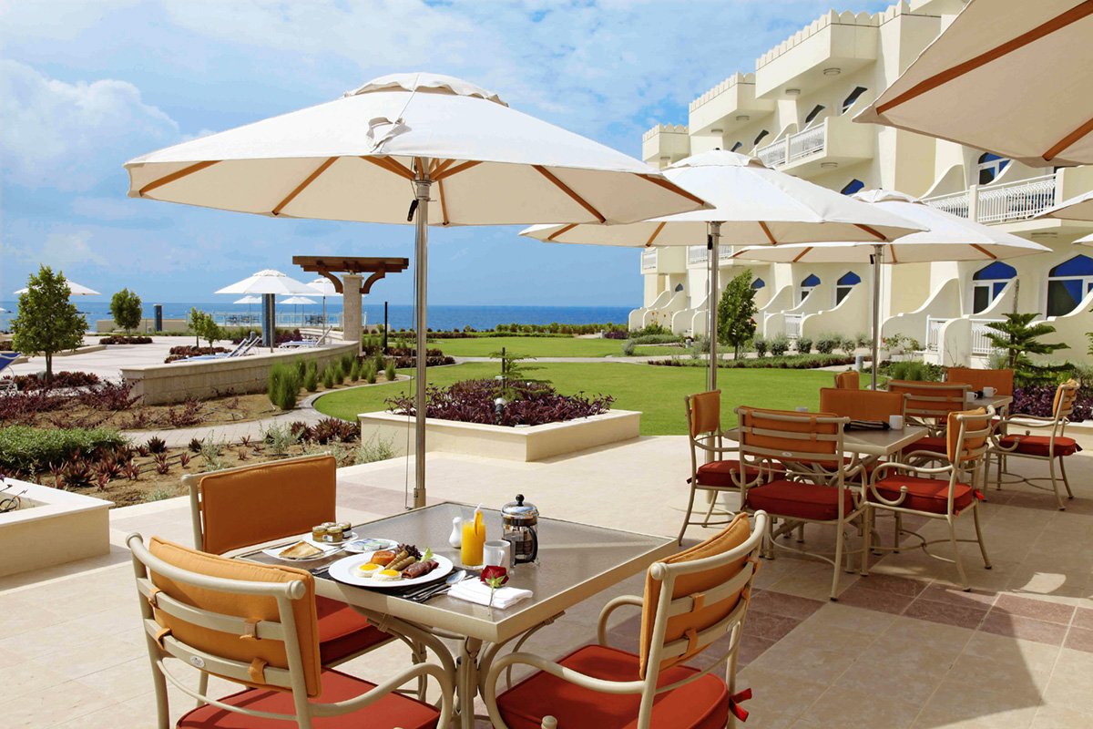 pięciogwiazdkowy, luksusowy, elegancki i stylowy, zbudowany w 2010 r., 237 pokoi, budynek główny i 18 budynków bocznych, 3 piętra, 6 wind, przestronne, eleganckie lobby, całodobowa recepcja, restauracje: Sumhuram – dania w formie bufetu, kuchnia międzynarodowa i regionalna, Al Dana – à la carte (dodatkowo płatna), owoce morza, w restauracjach dostępne foteliki i menu dla dzieci, dania wegetariańskie, bar Dhofar Piano Lounge, bar typu swim-up, The Cove English Pub, Mirbat – arabska kawiarnia; jubiler, pamiątki, kantor, 3 sale konferencyjne na 50, 200 i 350 osób; taras z widokiem na basen i palmowy ogród, bezpłatny internet bezprzewodowy w lobby; za opłatą: punkt internetowy (ok. 15 USD/godz.), całodobowy room-service, wypożyczalnia samochodów, centrum biznesowe, lekarz, opiekunka do dziecka, pralnia; akceptowane karty kredytowe: Visa, MasterCard, American Express, Diners Club.