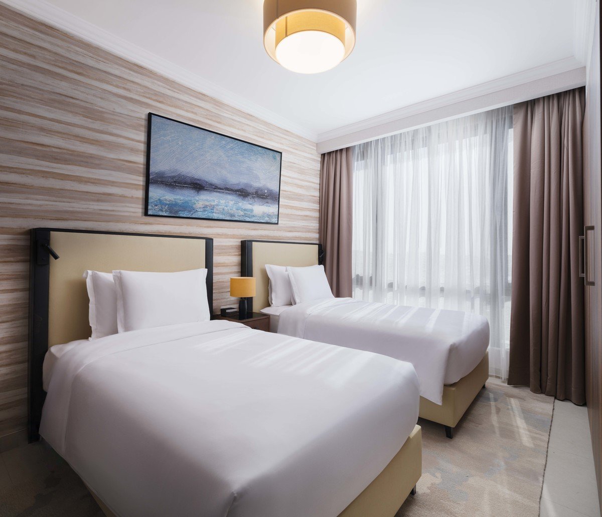 Należący do sieci Hilton, zlokalizowany w ekskluzywnej dzielnicy Muskatu – Qurum, blisko centrów handlowych i popularnych atrakcji, jak Park Przyrody Qurum i plaża Qurum, jest doskonałą propozycją zarówno na rodzinny urlop, jak i wyjazd we dwoje. Otwarty w 2023 r., oferuje przestronne apartamenty z 1 lub 2 sypialniami oraz wyposażonym aneksem kuchennym, a także doskonały poziom serwisu i nowoczesne udogodnienia. Goście znajdą tu elegancką restaurację serwującą pyszne dania kuchni międzynarodowej, dobrze wyposażoną siłownię oraz centrum spa. Wisienką na torcie jest taras z basenem na dachu hotelu, z którego roztacza się spektakularny widok na góry, wieczorem idealna sceneria na romantyczną kolację we dwoje.