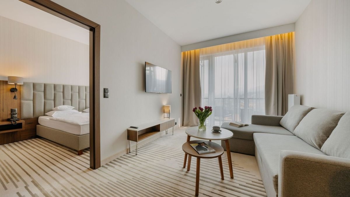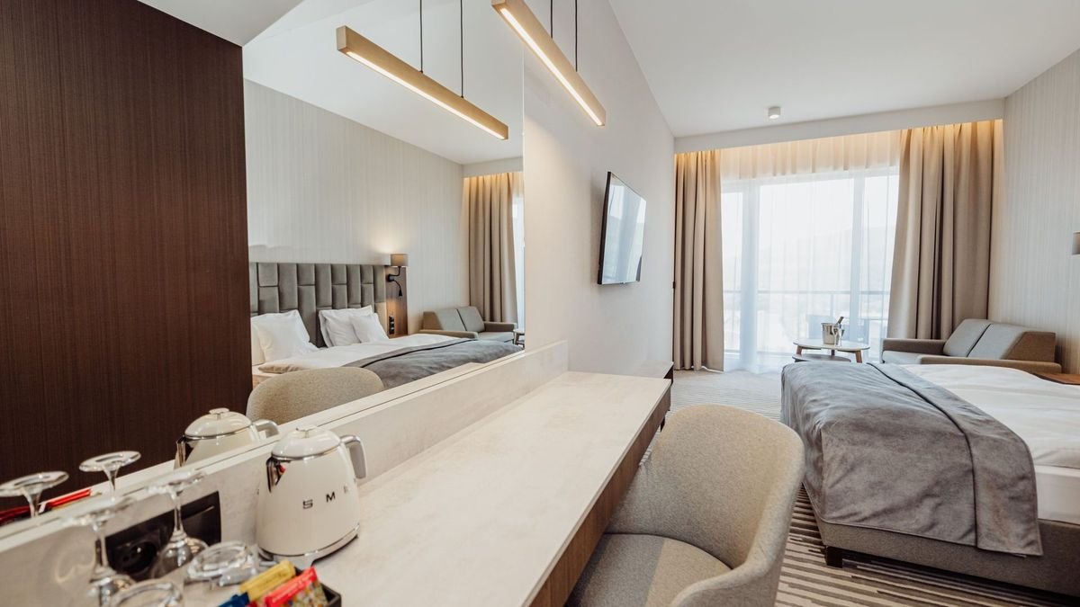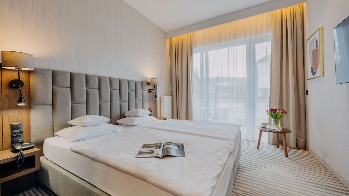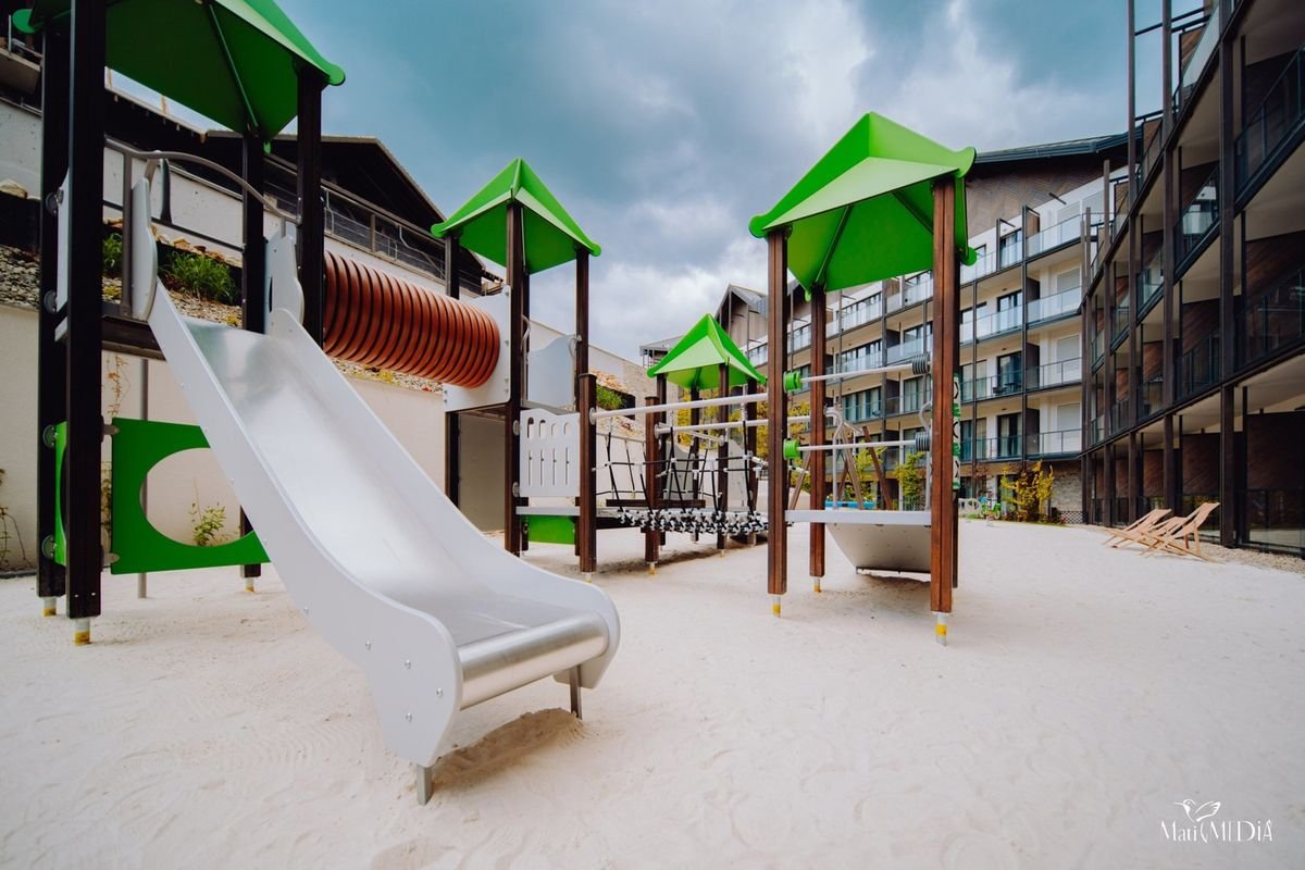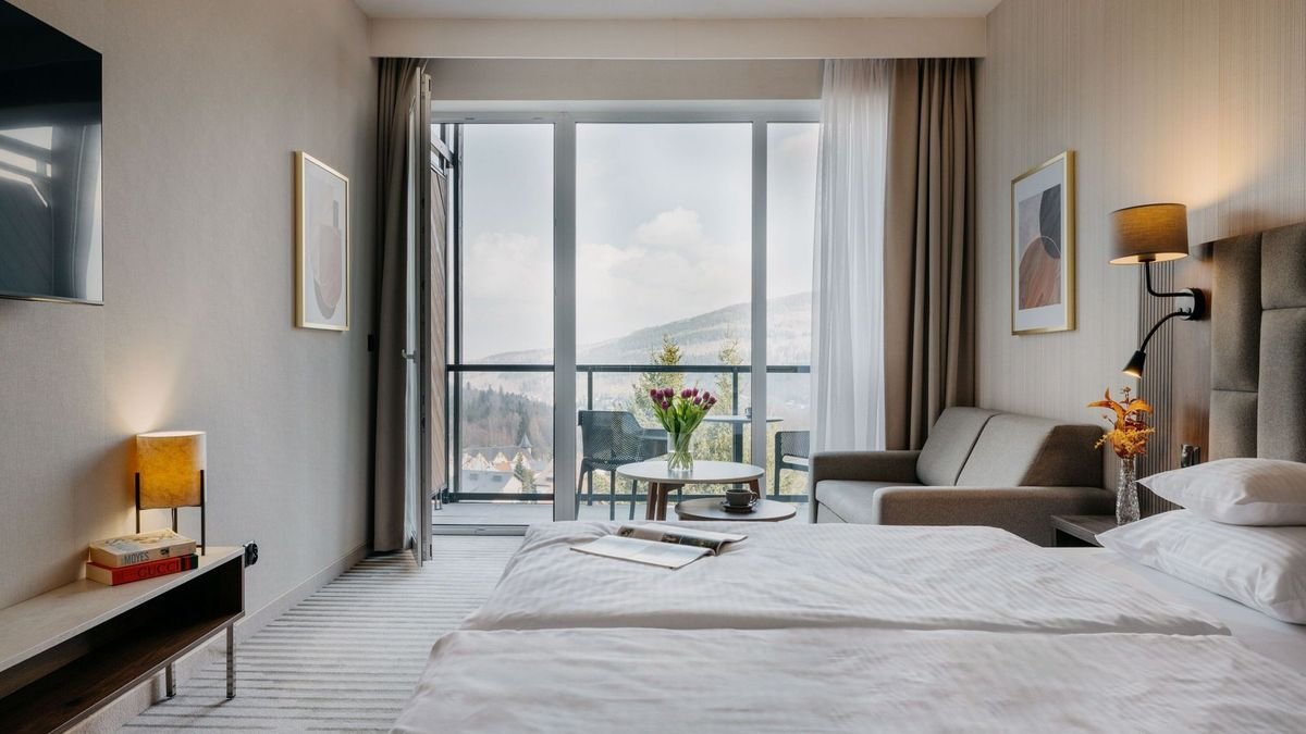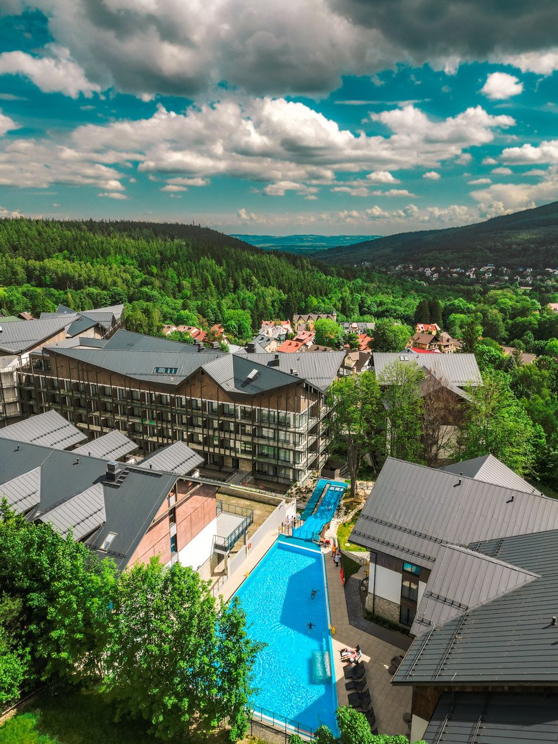 Nowoczesny, zbudowany z rozmachem, z widokiem na zieloną okolicę i górskie szczyty, zaprasza na beztroski rodzinny wypoczynek w Świeradowie-Zdroju. Poza malowniczym położeniem czeka tu na Ciebie wszystko to, co potrzebne do relaksu i wspaniałej zabawy. Zatrzymaj się w stylowym pokoju lub postaw na przestronny apartament i korzystaj z udogodnień, których jest tutaj całe mnóstwo – od profesjonalnego, świetnie wyposażonego spa z krytymi basenami, jacuzzi, saunami i bogatą ofertą zabiegów, po siłownię, zajęcia sportowe i ciekawe animacje. Dzieciaki pokochają to miejsce przede wszystkim za wodne atrakcje, w tym brodzik z 3 zjeżdżalniami, a dorośli docenią smaczną kuchnię serwowaną w hotelowej restauracji. Niezależnie od pory roku, to doskonały wybór na urlop zarówno zimą, jak i latem.
