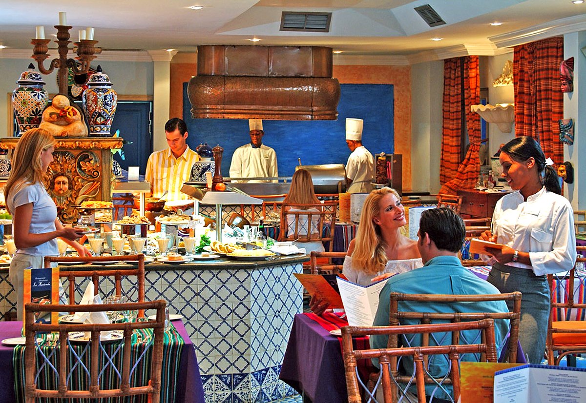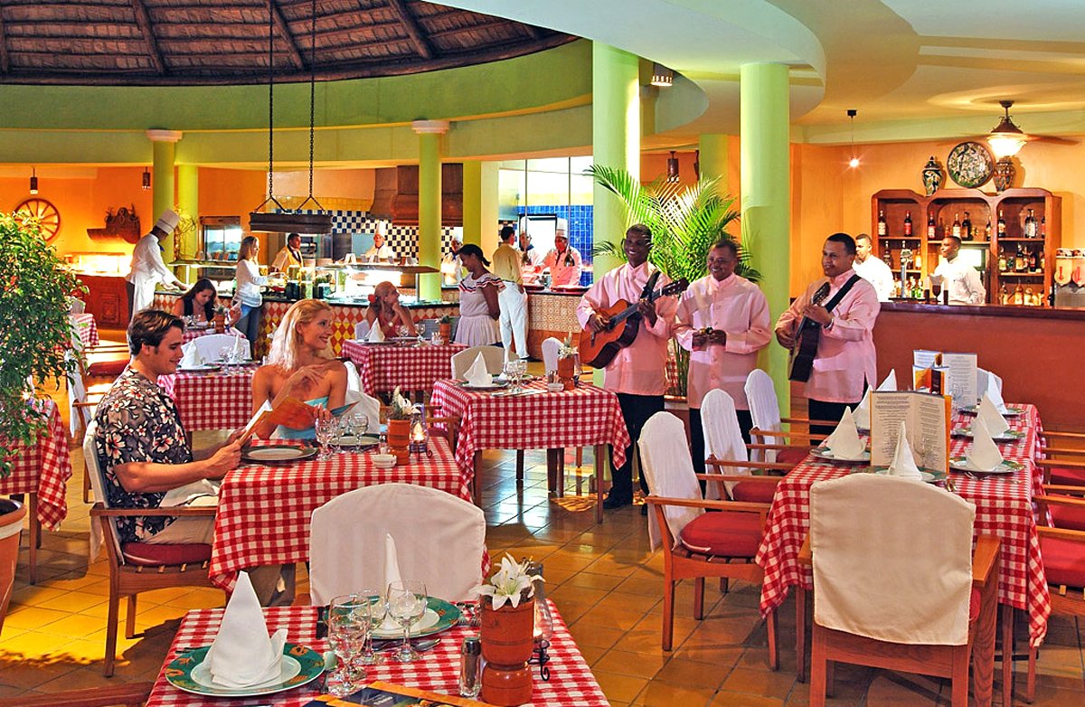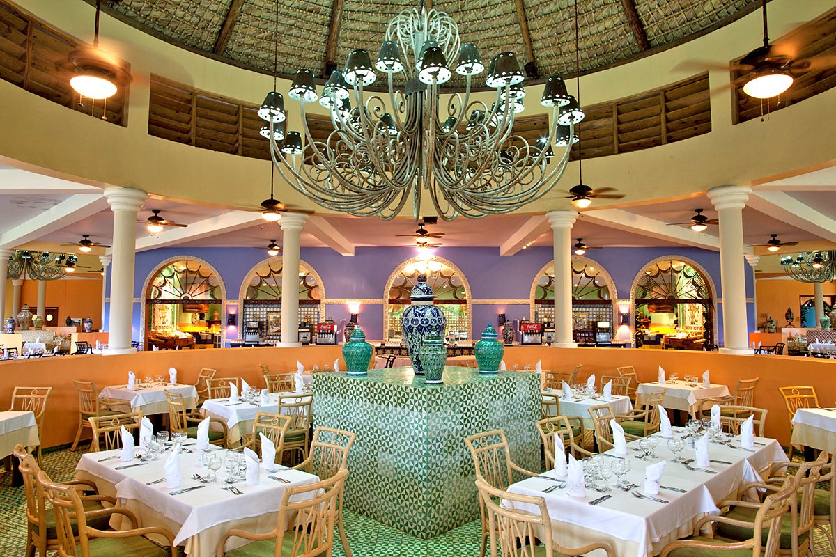 śniadanie (7.00-10.00), obiad (13.00-15.00), kolacja (18.30-22.00) w formie bufetu w restauracji El Mercado; późne śniadanie (10.00-12.00), przekąski (16.00-18.00) w El Bohio, przekąski w La Hacienda (23.00-7.00); napoje bezalkoholowe i lokalne napoje alkoholowe (10.00-23.00) w wyznaczonych barach; wymagane noszenie opasek all inlusive.