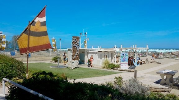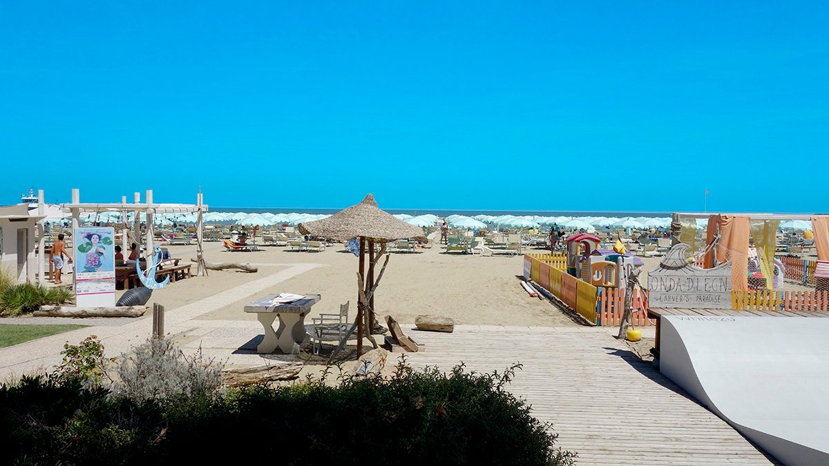 Elio 70-71, piaszczysta, łagodne zejście do morza, ok. 5 m od hotelu, przejście przez ulicę, parasole i leżaki płatne (ok. 15 EUR/os./dzień, cena uzależniona od położenia oraz terminu), aqua aerobik, turnieje tenisa stołowego; najbliższa plaża publiczna (bez serwisu): ok. 500 m.