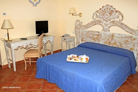 standardowy: 2-os. (możliwość 1 dostawki), ok. 20 m², urządzony w stylu sardyńskim, indywidualnie sterowana klimatyzacja, łazienka (wanna lub prysznic, wc; suszarka), bezpłatny internet bezprzewodowy, telewizja satelitarna, telefon, sejf; bezpłatne łóżeczko dla dziecka do 2 lat na zamówienie przed przyjazdem; junior suite: 2-os. (możliwość 1 lub 2 dostawek), ok. 30 m², zadbany, balkon, wyposażenie jak w pokoju standardowym; widok na morze i pokój junior suite za dopłatą.