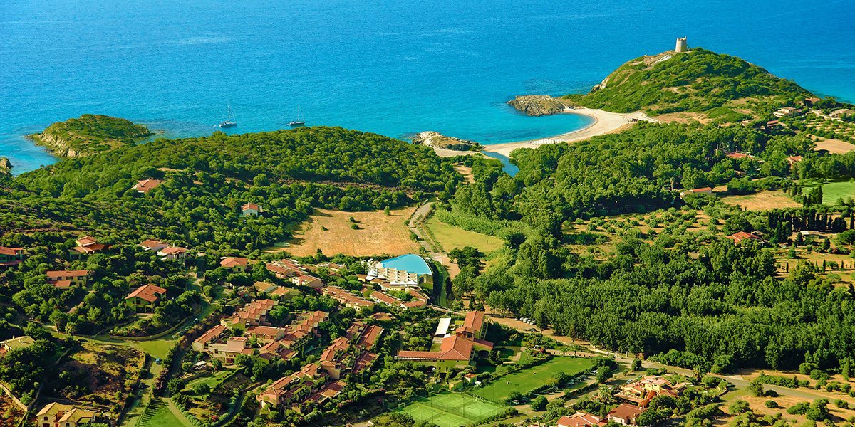 czterogwiazdkowy, przypomina sardyńskie miasteczko na wzgórzu, otoczone śródziemnomorską roślinnością, częściowo odnowiony w 2011 r., łącznie 221 pokoi o zróżnicowanej typologii, budynek główny z lobby, restauracją i mniejsze budynki z pokojami położone kaskadowo wokół budynku głównego, do 2 pięter, eleganckie lobby, całodobowa recepcja, duża restauracja główna z tarasem – dania w formie bufetu, specjalna strefa zaaranżowana dla dzieci, kuchnia śródziemnomorska i międzynarodowa, dostępne foteliki i menu dla dzieci, dania wegetariańskie, podczas kolacji obowiązuje strój formalny (panowie – długie spodnie), pizzeria (czynna sezonowo; dodatkowo płatna), 2 bary, w tym snack bar w okolicy basenu; niestrzeżony parking; centrum konferencyjne dla 300 osób, taras słoneczny z widokiem na zatokę, ogród z roślinnością śródziemnomorską o powierzchni ok. 2 tys. m²; za opłatą: internet bezprzewodowy w lobby; z uwagi na położenie hotel niepolecany osobom z ograniczeniami ruchowymi; akceptowane zwierzęta domowe do 10 kg (na zapytanie, za dopłatą); akceptowane karty kredytowe: Visa, MasterCard, Diners Club, America Express.