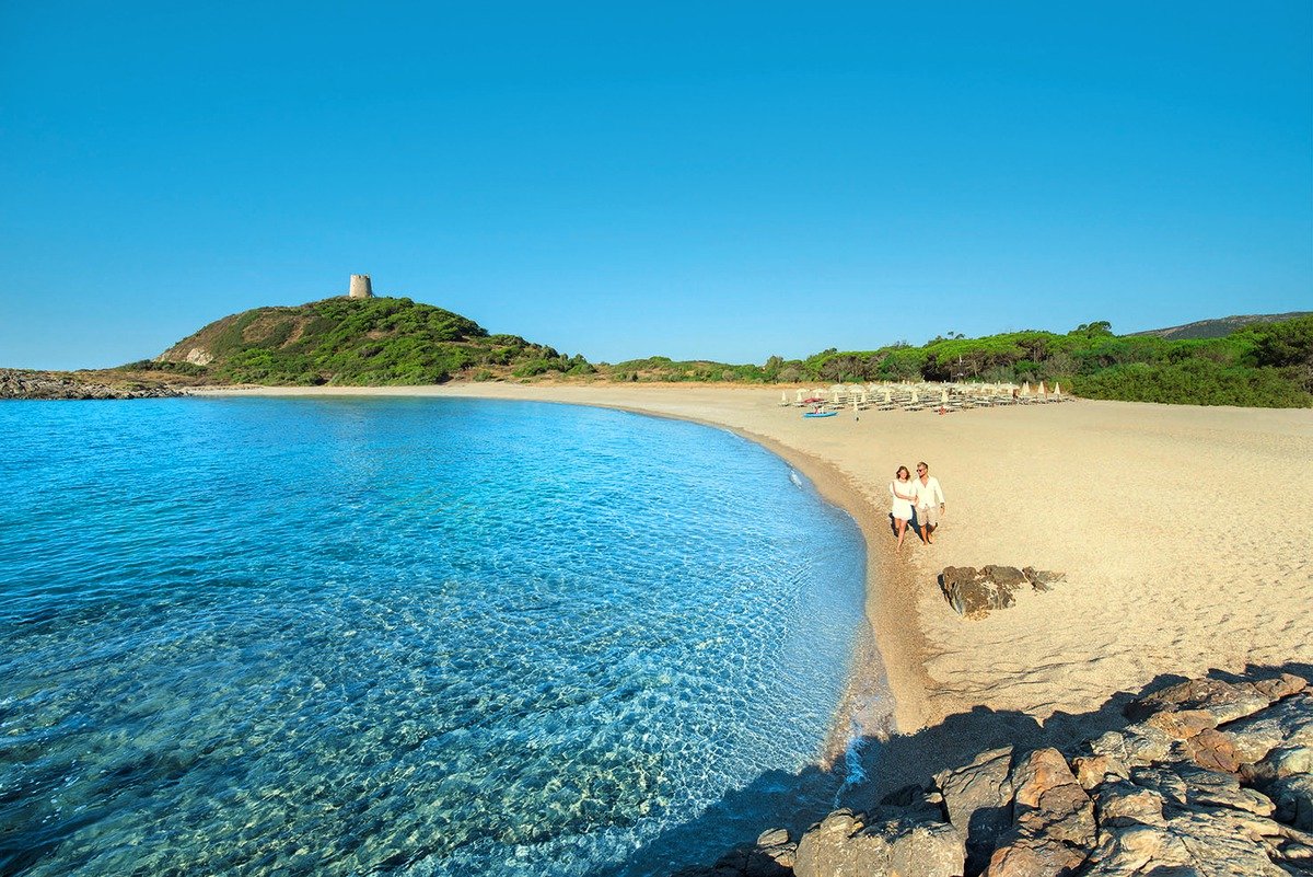 Porticciolo, hotelowa, piaszczysto-żwirkowa, w spokojnej zatoczce, łagodne zejście do morza, okresowo na plaży mogą występować algi, ok. 300-600 m od hotelu (zależnie od miejsca zakwaterowania), dojście ścieżką przez teren hotelu, bezpłatne parasole i leżaki (ilość ograniczona; leżaki w 1. i 2. rzędzie za dodatkową opłatą); w okolicy hotelu są dwie mniejsze plaże bez serwisu plażowego; Spiaggia de Tueredda, ok. 7 km od hotelu, piaszczysta, parasole i leżaki płatne; inne ładne plaże w okolicy to Monte Cogoni, Dune di Campana, Su Giudeu.