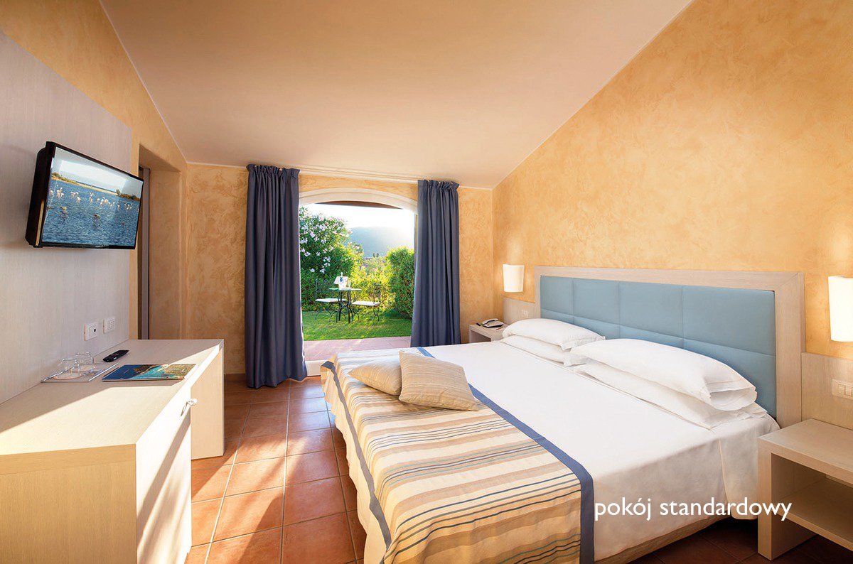 standardowy: 2-os. (możliwość 1 dostawki dla os. dorosłej lub 2 dostawek dla dzieci), ok. 18-24 m², utrzymany w sardyńskim stylu, indywidulanie sterowana klimatyzacja, łazienka (wanna lub prysznic, wc; suszarka), telewizor, sejf, minibar (płatny wg konsumpcji); bezpłatne łóżeczko dla dziecka do 2 lat; patio, taras lub ogródek (stolik i krzesełka); widok na morze za dopłatą; superior: 2-os. (możliwość 1 dostawki dla os. dorosłej lub 2 dostawek dla dzieci), położony bliżej budynku głównego, wyposażenie jak w pokoju standardowym; pokój superior za dopłatą.