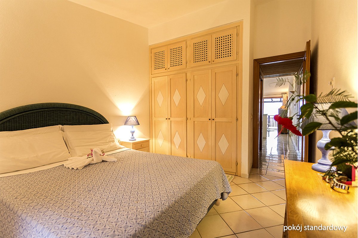 standardowy: 2-os. (możliwość 1 dostawki dla os. dorosłej lub 2 dostawek dla dzieci), ok. 15-20 m², urządzony w sardyńskim stylu, klimatyzowany, łazienka (wanna lub prysznic, wc; suszarka), telewizja, sejf, mała lodówka; łóżeczko dla dziecka do 2 lat na zamówienie przed przyjazdem (płatne: ok. 10 EUR/dzień); większość pokoi z balkonem lub tarasem (stolik i krzesełka); rodzinny: dla maks. 4 os., ok. 30-35 m², pokój dzienny i sypialnia oddzielona drzwiami, klimatyzowany, łazienka (wanna lub prysznic, wc; suszarka), telewizja, mała lodówka, sejf; łóżeczko dla dziecka do 2 lat na zamówienie przed przyjazdem (płatne: ok. 10 EUR/dzień); większość pokoi z balkonem lub tarasem (stolik i krzesełka); pokój rodzinny za dopłatą.