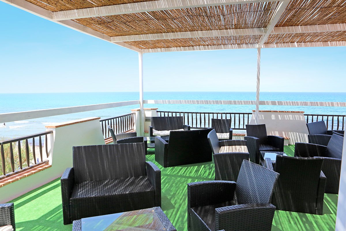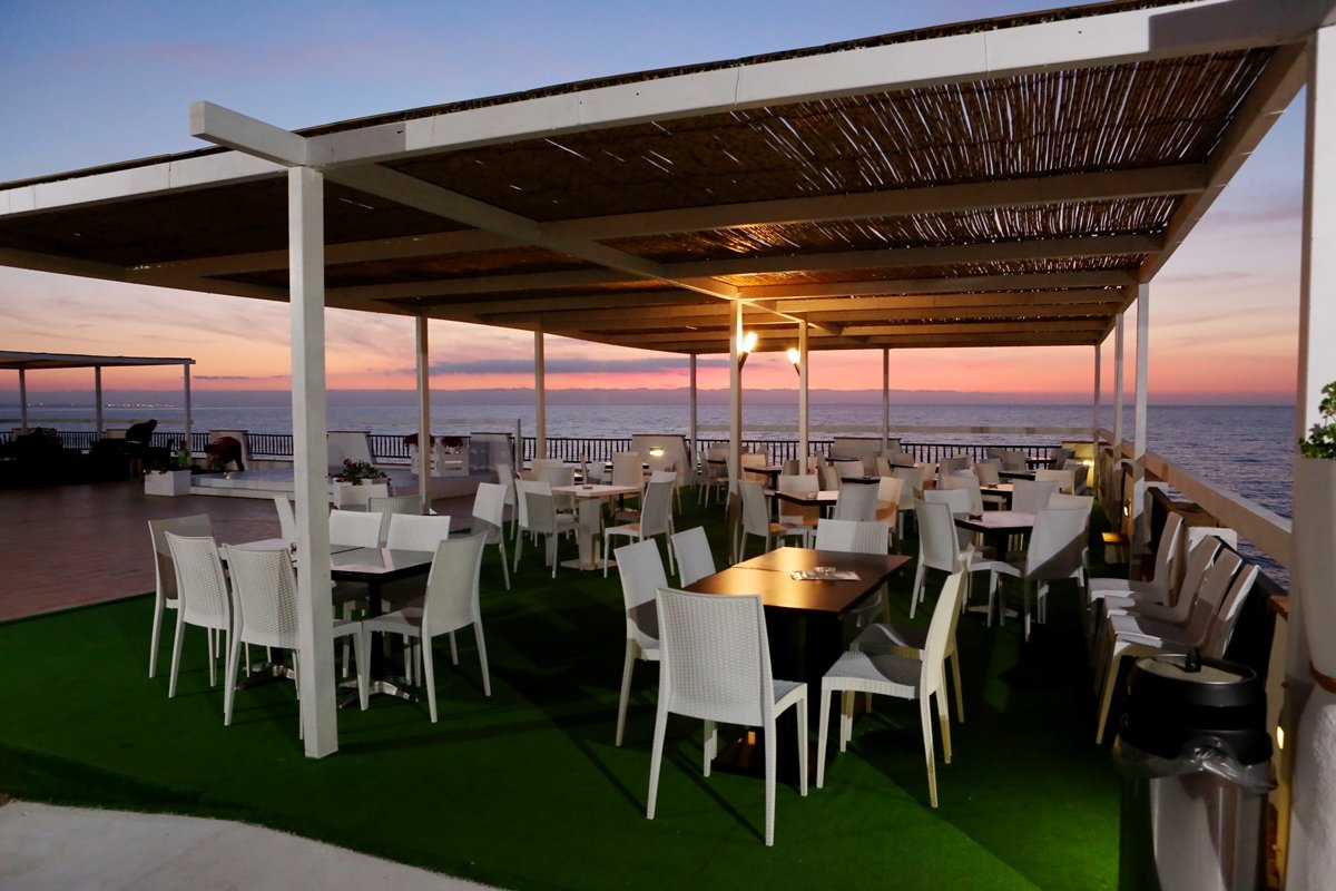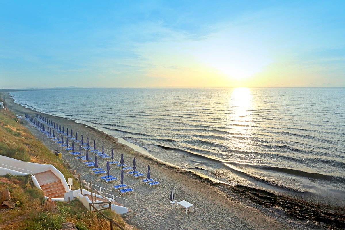 publiczna, wydzielony odcinek hotelowy, ciemny piasek, miejscami występują kamienie naniesione przez morze (ich ilość uzależniona jest od pory roku), bezpośrednio przy hotelu, odległość zależna od zakwaterowania (od ok. 50 do ok. 600 m), zejście po schodach, bezpłatne parasole i leżaki (dostępne w miarę wolnych miejsc).