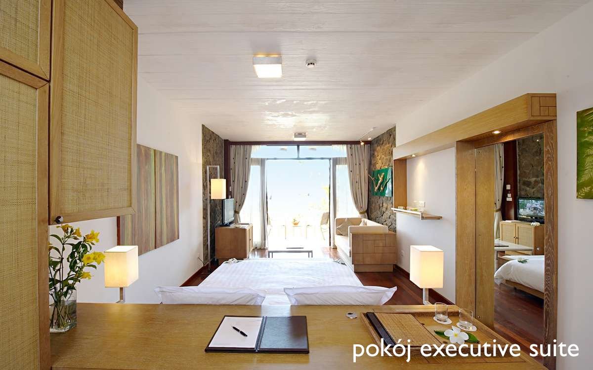 superior garden view 2-os. (możliwość 1 dostawki lub łóżeczko dla dziecka), nowoczesny i zadbany, ok. 35 m², klimatyzowany, łazienka (prysznic, wc; suszarka), telewizor, minibar (płatny), telefon, sejf, zestaw do kawy/herbaty; bezpłatne łóżeczko dla dziecka do 2 lat na zamówienie przed przyjazdem; taras (stolik i krzesełka), widok na ogród.; deluxe ocean view: 2-os. (możliwość 1 dostawki lub łóżeczko dla dziecka), ok. 33 m², wyposażenie jak w pokoju superior, balkon (stolik i krzesełka), frontalny lub boczny widok na ocean (widok może ograniczać roślinność).; executive suite: 2-os. (możliwość 1 lub 2 dostawek - sofa), ok. 65 m², elegancki i nowoczesny, wyposażenie jak w pokoju superior, balkon (stolik i krzesełka), frontalny lub boczny widok na ocean (widok może ograniczać roślinność).