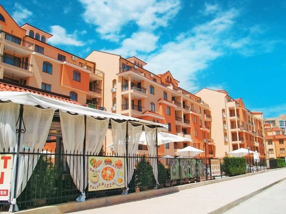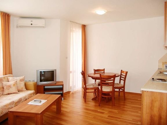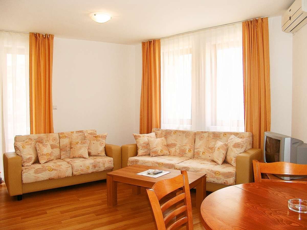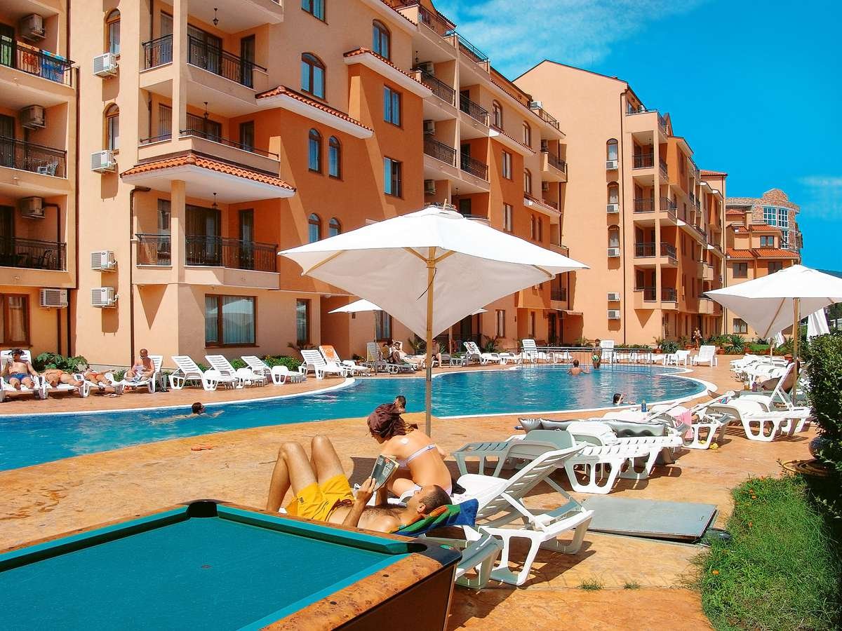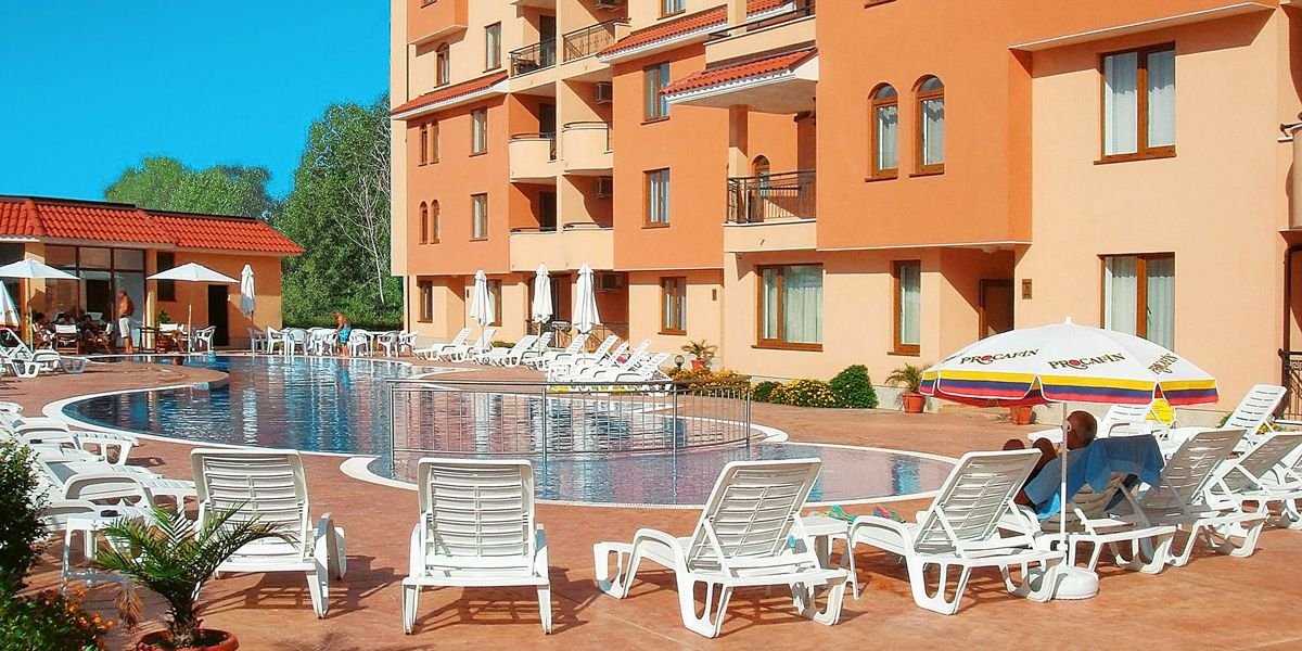 trzygwiazdkowy, nowoczesny, starannie utrzymany, zbudowany w 2006 r., 40 apartamentów, 1 budynek, 5 pięter, 4 windy, hol, recepcja (9.00-21.00); bar przy basenie, sklepik: art. spożywcze, prasa; za opłatą: sejf w recepcji (5 BGN/dzień).