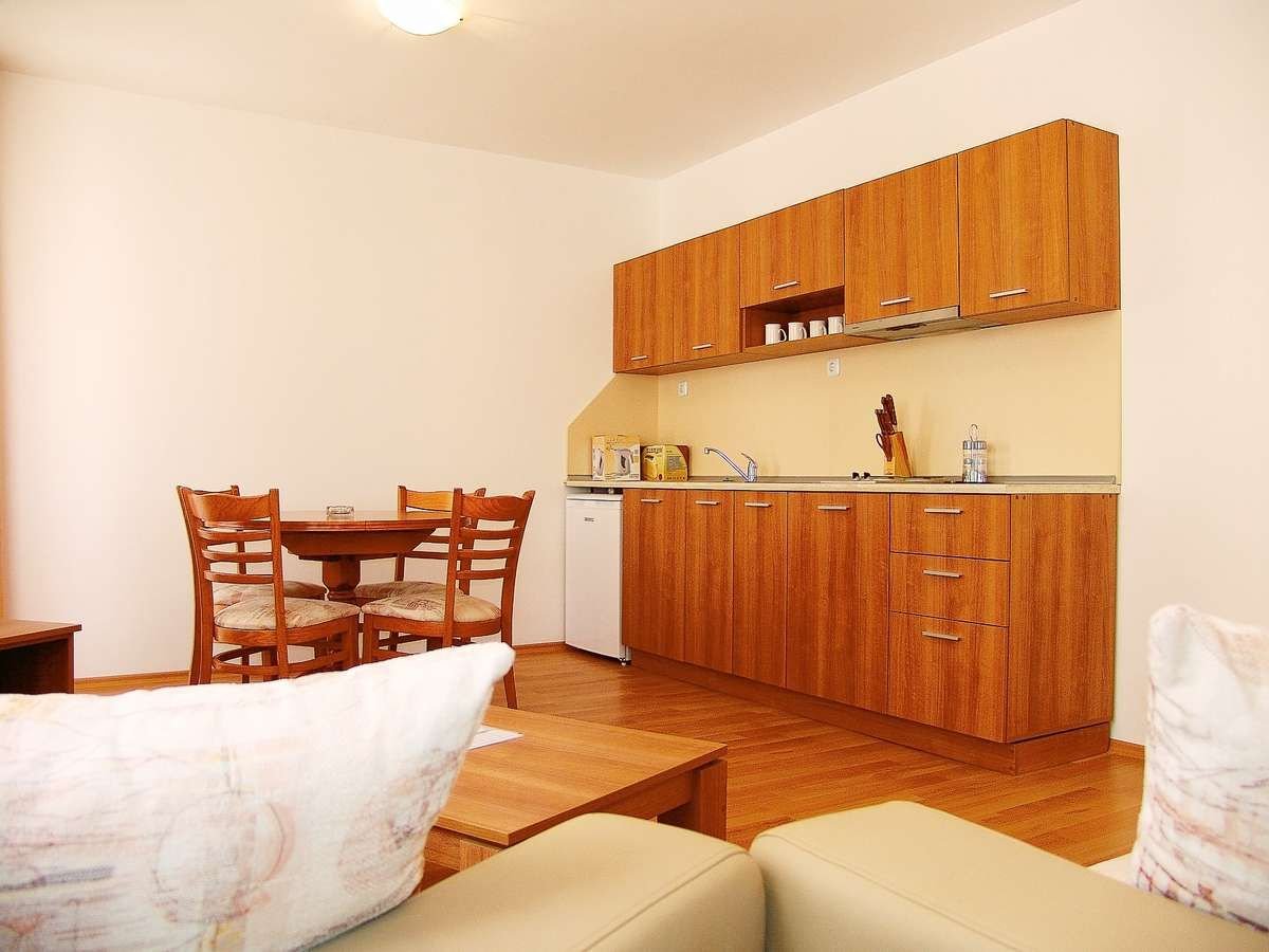 Aparthotel to wygodne rozwiązanie dla turystów, którzy cenią niezależność i swobodę w organizowaniu wolnego czasu. Rodziny z dziećmi także znajdą tu komfortowe warunki do wypoczynku dzięki obszernym, zadbanym i klimatyzowanym apartamentom wyposażonym w aneksy kuchenne. Zaletą tego miejsca jest również bliskość centrum wakacyjnego kurortu i fantastycznego parku wodnego Aquapark Action.
