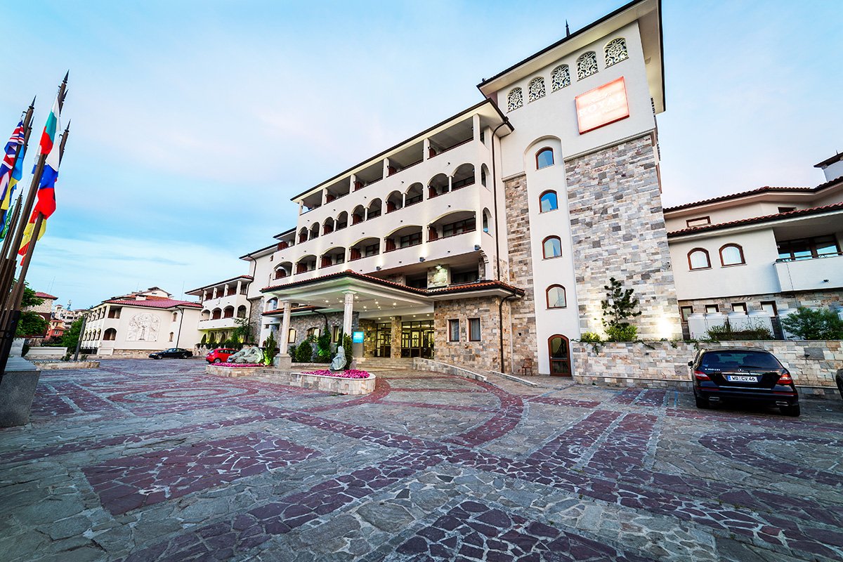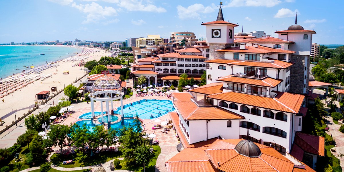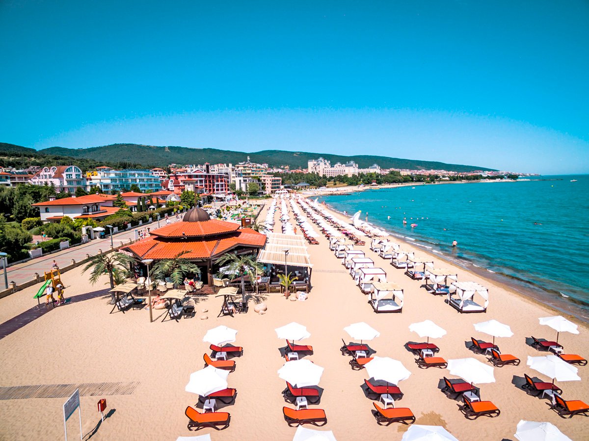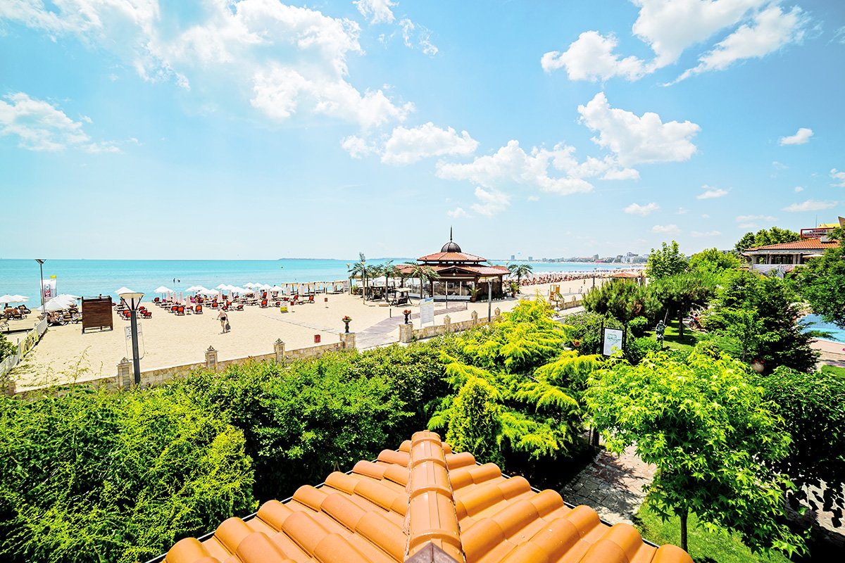 w północnej, spokojnej części SŁONECZNEGO BRZEGU, ok. 2,5 km od centrum, w pobliżu dobrze zaopatrzony supermarket; ok. 2 km do St. Vlas, ok. 9,5 km od Nessebaru; ok. 35 km od lotniska w Burgas, ok. 95 km od lotniska w Warnie; przystanek autobusowy ok. 150 m od hotelu (ok. 1 BGN/centrum Słonecznego Brzegu/St. Vlas).