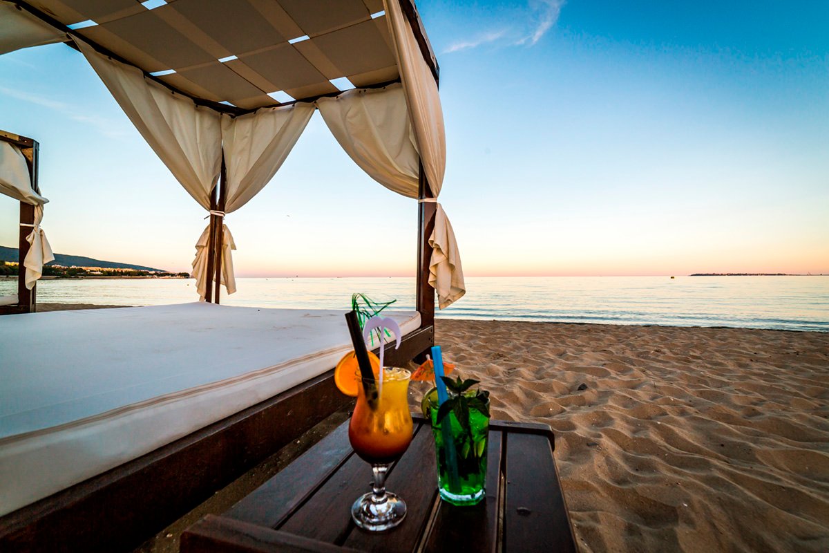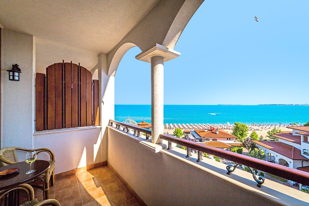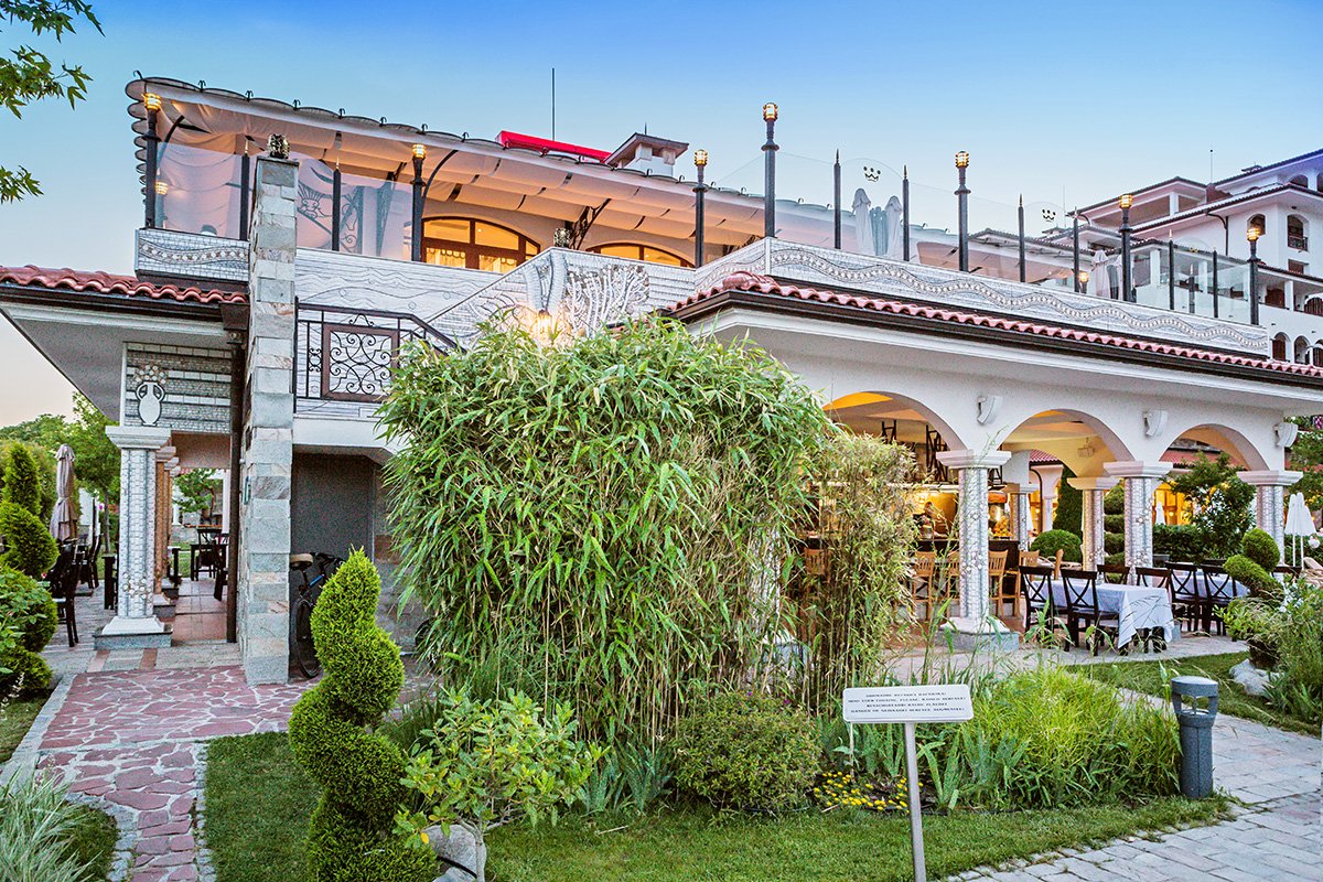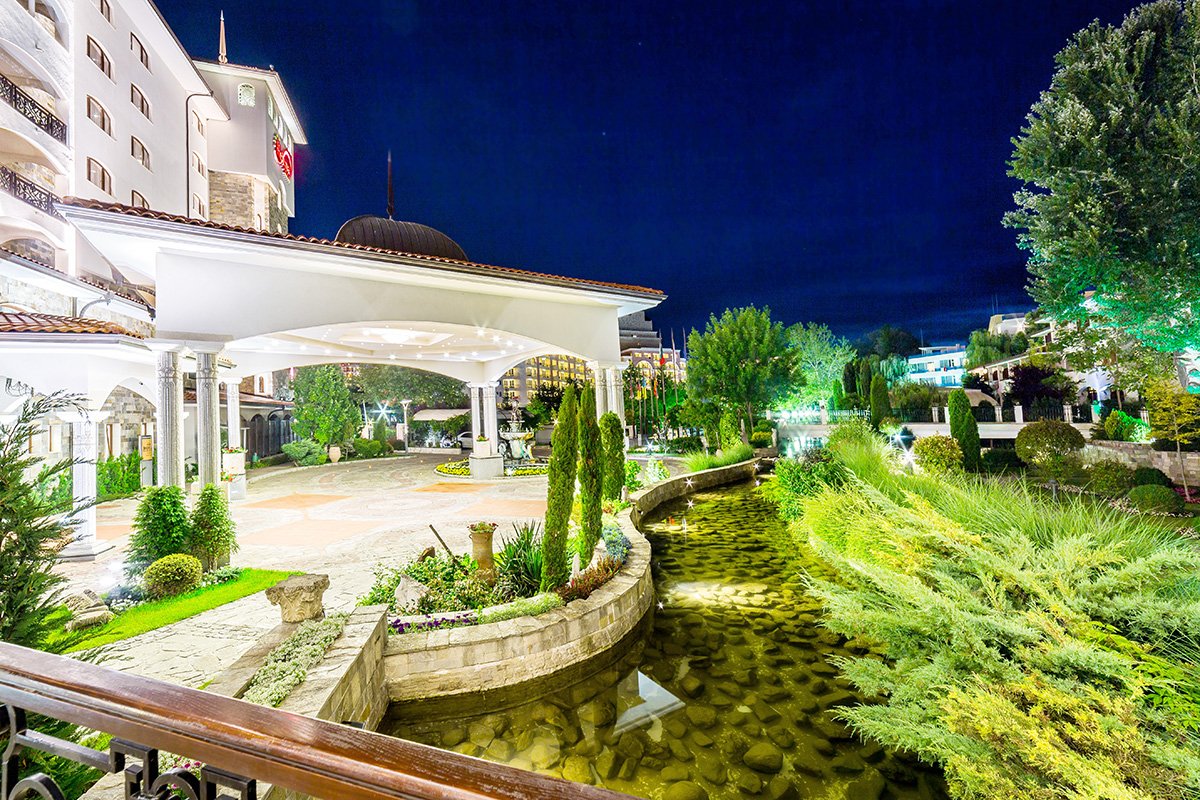 w północnej, spokojnej części SŁONECZNEGO BRZEGU, ok. 2,5 km od centrum, w pobliżu dobrze zaopatrzony supermarket; ok. 2 km do St. Vlas, ok. 9,5 km od Nessebaru; ok. 35 km od lotniska w Burgas, ok. 95 km od lotniska w Warnie; przystanek autobusowy ok. 150 m od hotelu (ok. 1 BGN/centrum Słonecznego Brzegu/St. Vlas).