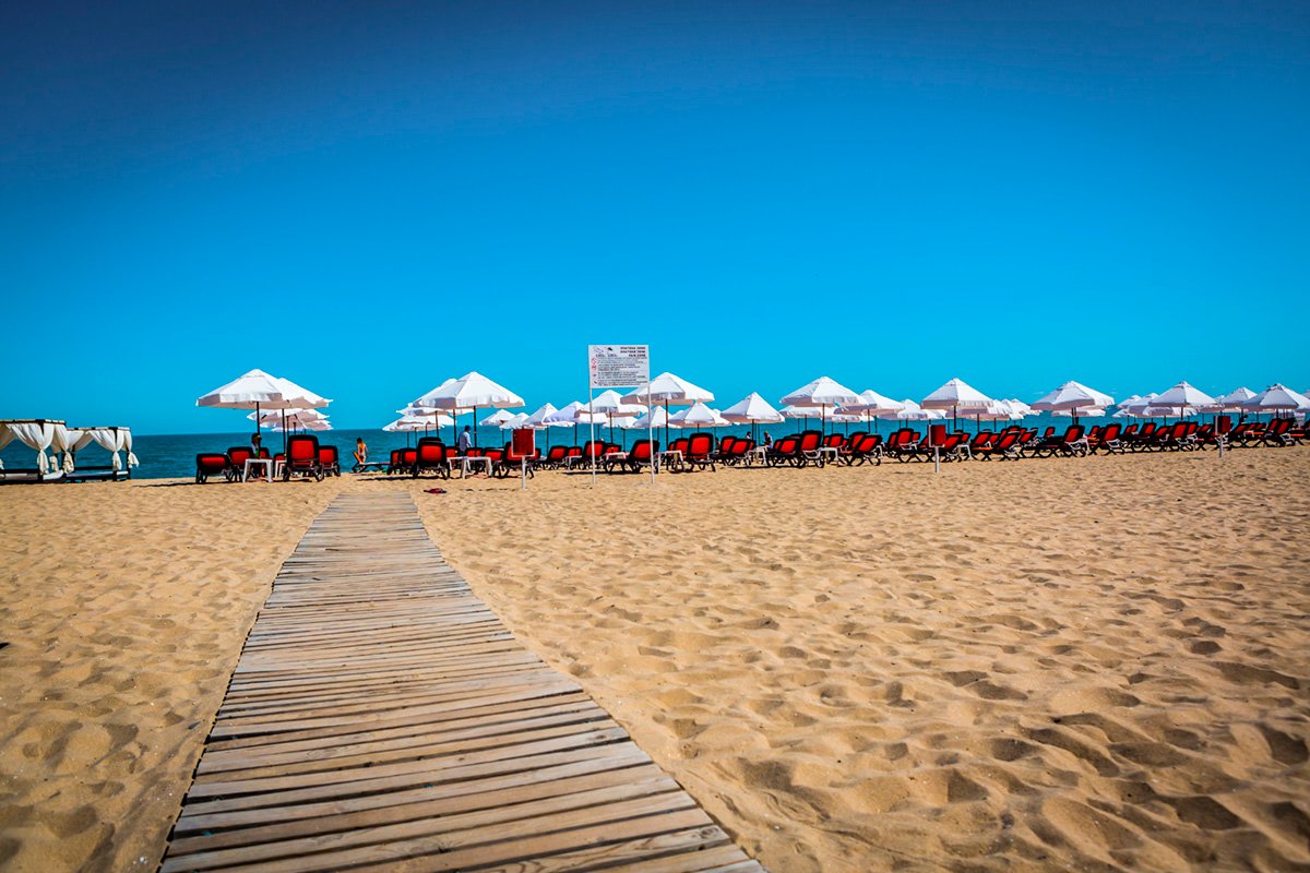 publiczna, piaszczysta, szeroka, łagodne zejście do morza, wyróżniona certyfikatem Błękitna Flaga, ok. 70 m od recepcji; dojście do plaży przez teren hotelu i nadmorską promenadę, na wydzielonym odcinku plaży bezpłatne ręczniki, parasole, leżaki (komplet: 2 leżaki+parasol/pokój; w miarę dostępności).