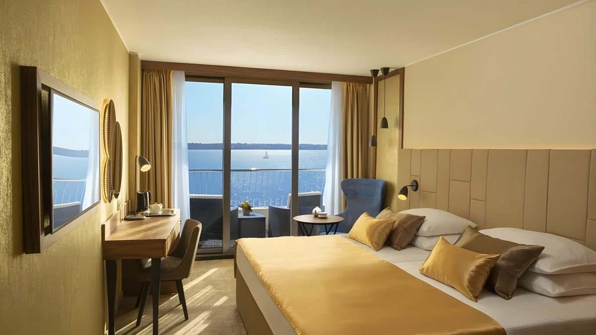 Bajecznie położony tuż przy morzu i plaży zaprasza na wyjątkowy urlop w Portorož, niedaleko klimatycznego centrum miasta Piran. Eleganckie wnętrza i komfortowe pokoje z balkonami i zapierającym dech widokiem na Adriatyk, restauracje serwujące pyszną kuchnię, a nawet kawiarnia to zapowiedź wypoczynku w wyjątkowym otoczeniu. Dla najmłodszych czekają dodatkowe atrakcje: brodzik, baseny z wodnym placem zabaw, animacje oraz miniklub. Goście mogą również korzystać z aquaparku przy hotelu Histrion i basenu przy hotelu Vile Park. Dasz się skusić?