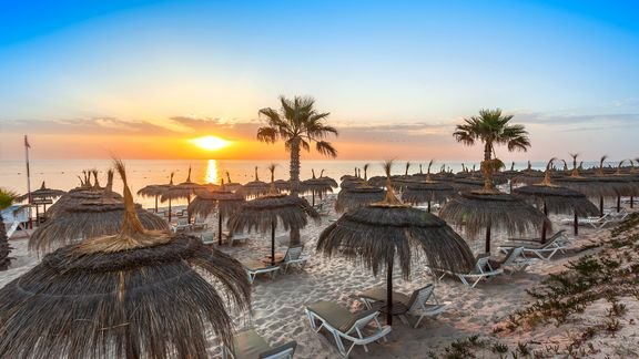 hotelowa, piaszczysta, wyróżniona certyfikatem Błękitna Flaga, bezpośrednio przy hotelu, przejście przez teren hotelu, bezpłatne parasole, leżaki i materace, ręczniki (depozyt: ok. 15 TND); bar i restauracja objęte all inclusive.