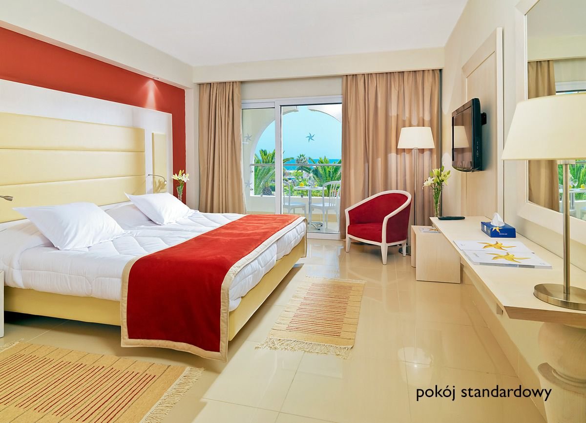 standardowy: 2-os. (możliwość 1 dostawki), ok. 24-27 m², elegancki, przestronny, indywidualnie sterowana klimatyzacja (15.06-15.09) lub ogrzewanie, łazienka (wanna, wc; suszarka), telewizja satelitarna, telefon; za opłatą: sejf (ok. 3,5 TND/dzień), minibar (raz na pobyt woda); bezpłatne łóżeczko dla dziecka do 2 lat na zamówienie przed przyjazdem; balkon lub taras (stolik i krzesełka); widok na morze za dopłatą; rodzinny: 2-os. (możliwość 1 lub 2 dostawek, maks. 3 os. dorosłe), łazienka (wanna/prysznic, wc), pokój dzienny, sypialnia, wyposażenie jak w pokoju standardowym; pokój rodzinny za dopłatą.