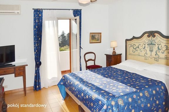 standardowy: 2-os. (możliwość 1 dostawki), ok. 20 m², zadbany, centralnie sterowana klimatyzacja (w lipcu i sierpniu), łazienka (wanna lub prysznic, wc; suszarka), łóżeczko dla dziecka do 2 lat na zamówienie przed przyjazdem (płatne); widok na morze na zamówienie, za dopłatą.
