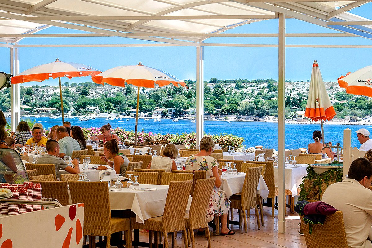 śniadanie (7.30-9.30), obiad (12.30-14.00), kolacja (19.30-21.00) w formie bufetu w restauracji głównej; do obiadu i kolacji nielimitowane lokalne wino i woda.