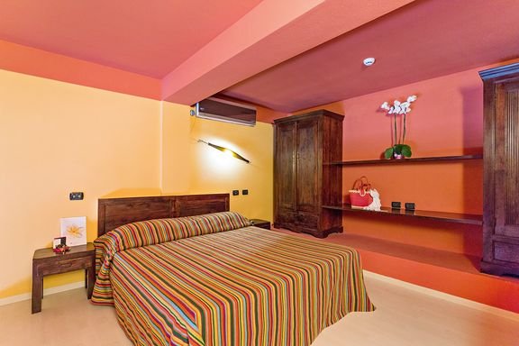 apartament: 2-os. (możliwość 1 dostawki dla os. dorosłej lub 2 dostawek dla dzieci), klimatyzowany, łazienka (wanna lub prysznic, wc; suszarka); telewizja, telefon, lodówka; łóżeczko dla dziecka do 2 lat na zamówienie przed przyjazdem (płatne, ok 7 EUR/dzień); część apartamentów z antresolą, część z aneksami kuchennymi (płyta grzewcza, naczynia, sztućce).