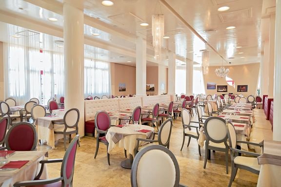 śniadanie (7.30-09.30), obiad (12.30-14.00), kolacja (19.30-21.00) w formie bufetu lub serwowane w restauracji głównej; do posiłków nielimitowana woda oraz wino.