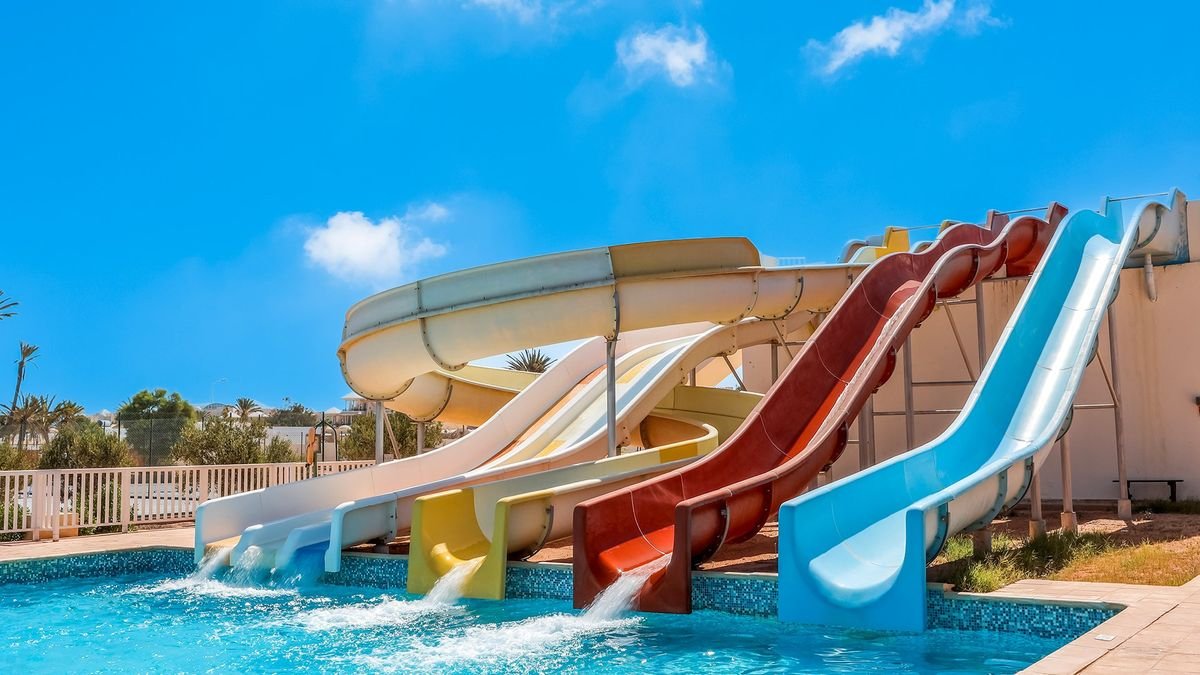 •2 baseny, słodka woda, ok. 1300 m² i ok. 350 m², gł. 1-1,6 m•2 brodziki: słodka woda, gł. do 0,5 m•basen z 4 zjeżdżalniami, słodka woda, gł. 1,4 m