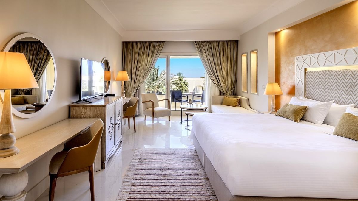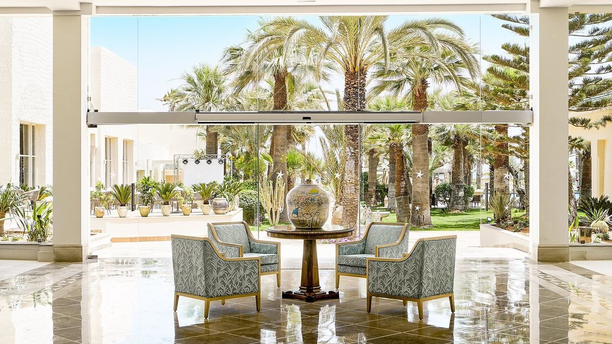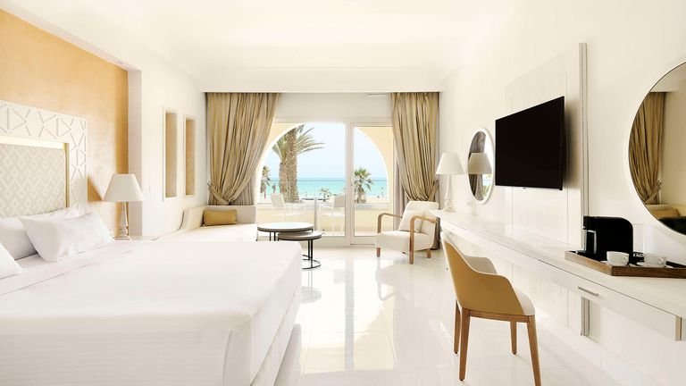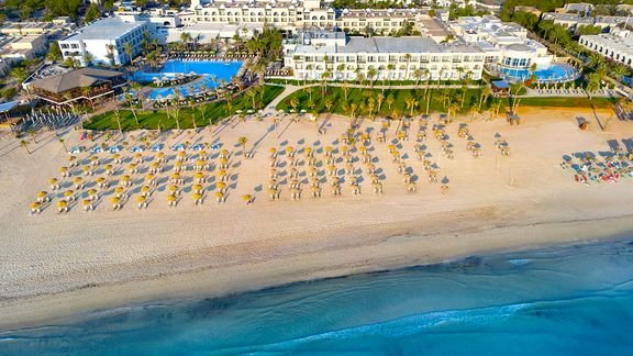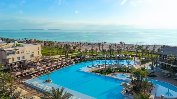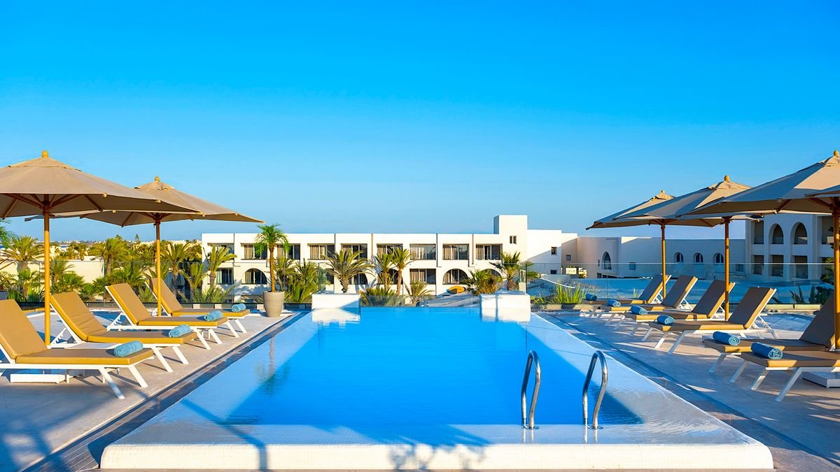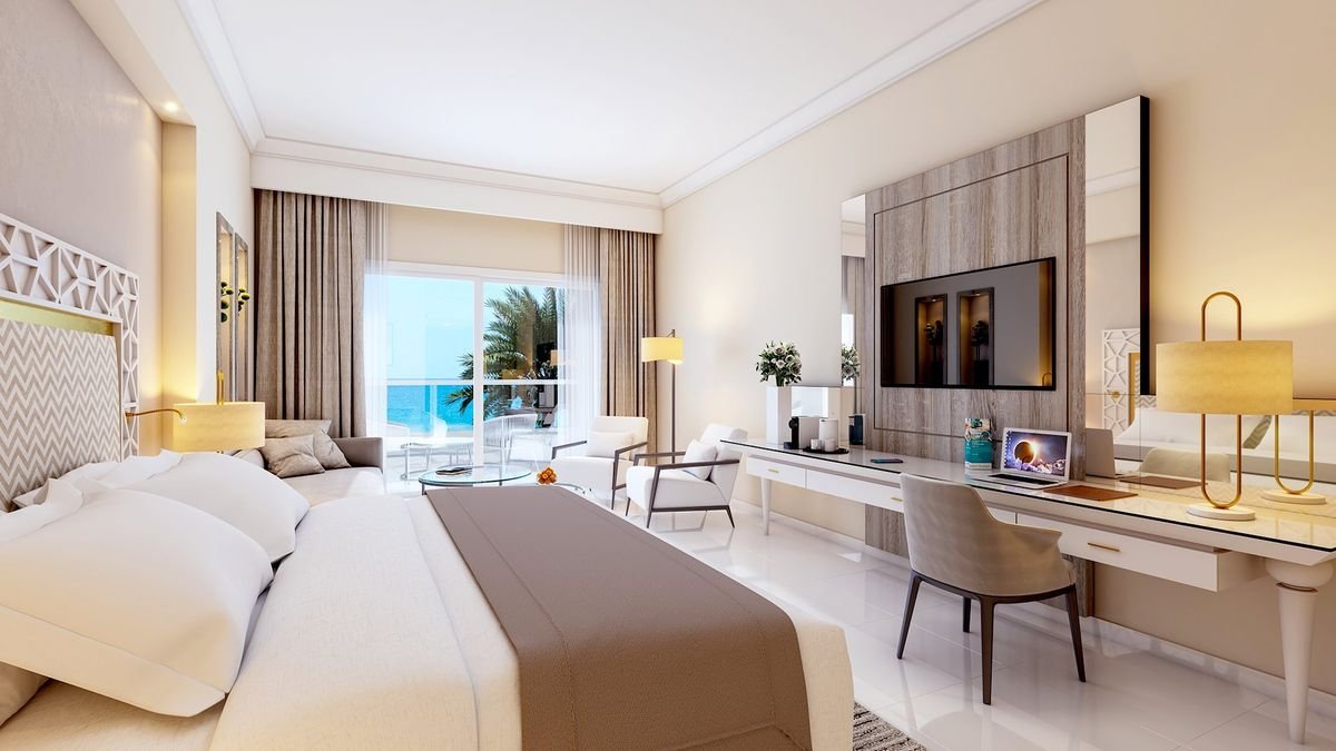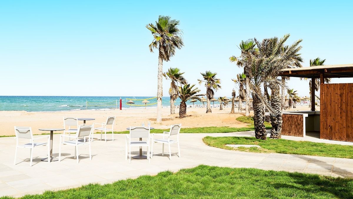 Niech żyją wakacje! Tutaj przykuwa wzrok intensywna zieleń chwiejących się na wietrze palm, pięknie zaaranżowane baseny gwarantują orzeźwienie w upalne dni, a jasny piasek spotyka się z lazurem Morza Śródziemnego – witaj na Djerbie, wyspie, która w 2023 r. została wpisana na listę UNESCO i zbiera coraz więcej zwolenników! Odpocznij w pokojach z widokiem na ogród, który zachwyca nie tylko roślinnością, ale i wielkością, opalaj się na leżaku, weź udział w animacjach i spróbuj nauki języka arabskiego – wszystko to w cudownych okolicznościach przyrody i wyszukanych hotelowych wnętrzach. Prezentowany materiał graficzny przedstawia wizualizację obiektu.
