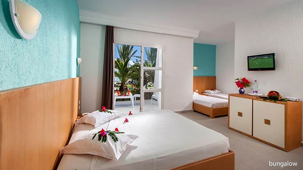 bungalow: 2-os. (możliwość 1 lub 2 dostawek), ok. 20 m², skromny, klimatyzowany (w terminie: 15.06-15.09), łazienka (wanna lub prysznic, wc), telewizja satelitarna, telefon, sejf (płatny: ok. 10 TND/dzień); bezpłatne łóżeczko dla dziecka do 2 lat na zamówienie przed przyjazdem; balkon lub taras (stolik i krzesełka); widok na ogród lub basen; standardowy w budynku głównym: 2-os. (możliwość 1 lub 2 dostawek), ok. 20 m², wyposażenie jak w bungalowie; pokój standardowy w budynku głównym za dopłatą; widok na morze za dopłatą.
