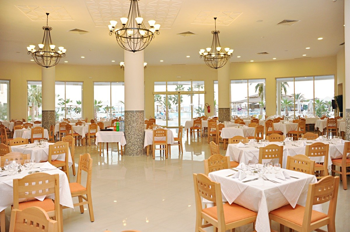 śniadanie (6.00-10.00), obiad (12.30-14.30), kolacja (18.30-21.30) w formie bufetu w restauracji głównej; późne śniadanie w barze w lobby lub barze przy basenie (10.00-11.00); przekąski: pizza, sałatki, pasta, kanapki, ciasta (15.00-18.00) oraz późne przekąski: kanapki, sałatki (22.30-6.00) w wyznaczonych barach; napoje bezalkoholowe i lokalne alkohole: wino, piwo, gin, boukha, wódka, whisky w wyznaczonych barach, całodobowo w barze w lobby; raz na pobyt kolacja w restauracji á la carte tunezyjskiej lub włoskiej; wymagane noszenie opasek ultra all inclusive.