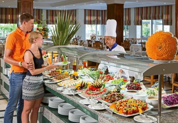 śniadanie (7.00-10.00), obiad (12.30-15.00), kolacja (18.30-22.00) w formie bufetu w restauracji głównej; woda mineralna, zimne napoje bezalkoholowe, lokalne wino i piwo do obiadu i kolacji; przekąski: pizza, pasta, kanapki, naleśniki, ciasta, lody (10.30-12.00, 15.30-18.30) w wyznaczonych restauracjach i barach; kawa, herbata, gorąca czekolada, zimne napoje bezalkoholowe, lokalne alkohole w wyznaczonych barach (maj-październik: 10.00-24.00 oraz listopad-kwiecień: 10.00-24.00); wymagane noszenie opasek all inclusive.
