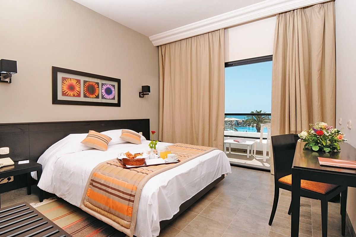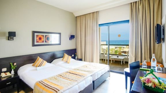 standardowy: 2-os. (możliwość 1 lub 2 dostawek), ok. 24 m², komfortowy, klimatyzowany (15.06-15.09), łazienka (wanna z prysznicem, wc; suszarka), telewizja satelitarna (wymagany depozyt), telefon; za opłatą: sejf (2 TND/dzień), minibar (na zamówienie, płatny wg konsumpcji); bezpłatne łóżeczko dla dziecka do 2 lat na zamówienie przed przyjazdem; balkon lub taras (stolik i krzesła, suszarka); widok na morze i pokój z 2 dostawkami za dopłatą.
