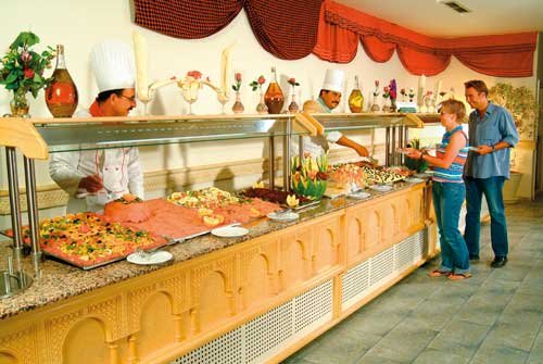 śniadanie (6.30-10.00), obiad (12.30-14.30), kolacja (18.30-21.00) w formie bufetu w restauracji głównej Calypso; woda mineralna, napoje gazowane, lokalne piwa i wina do obiadu i kolacji; popołudniowe i późnowieczorne przekąski: dania grillowane, pizza, kanapki, hamburgery, frytki, owoce (12.00-17.00, 23.00-1.30) w snack-barze Coco Loco; 1 posiłek à la carte/pobyt/os. w każdej z restauracji à la carte: tunezyjskiej i włoskiej; kawa, herbata, woda mineralna, napoje gazowane, soki, lokalne alkohole (10.00-24.00) w lobby-barze i w snack-barze oraz (23.00-2.00) w dyskotece. Wymagane noszenie opasek all inclusive.