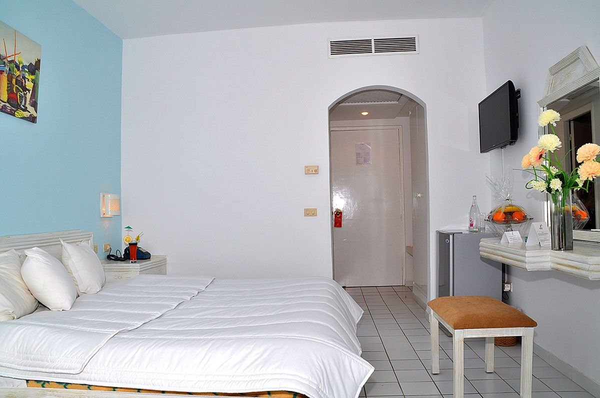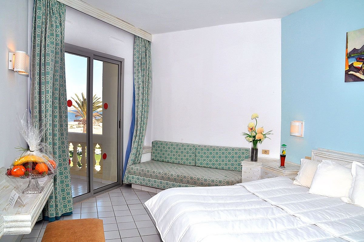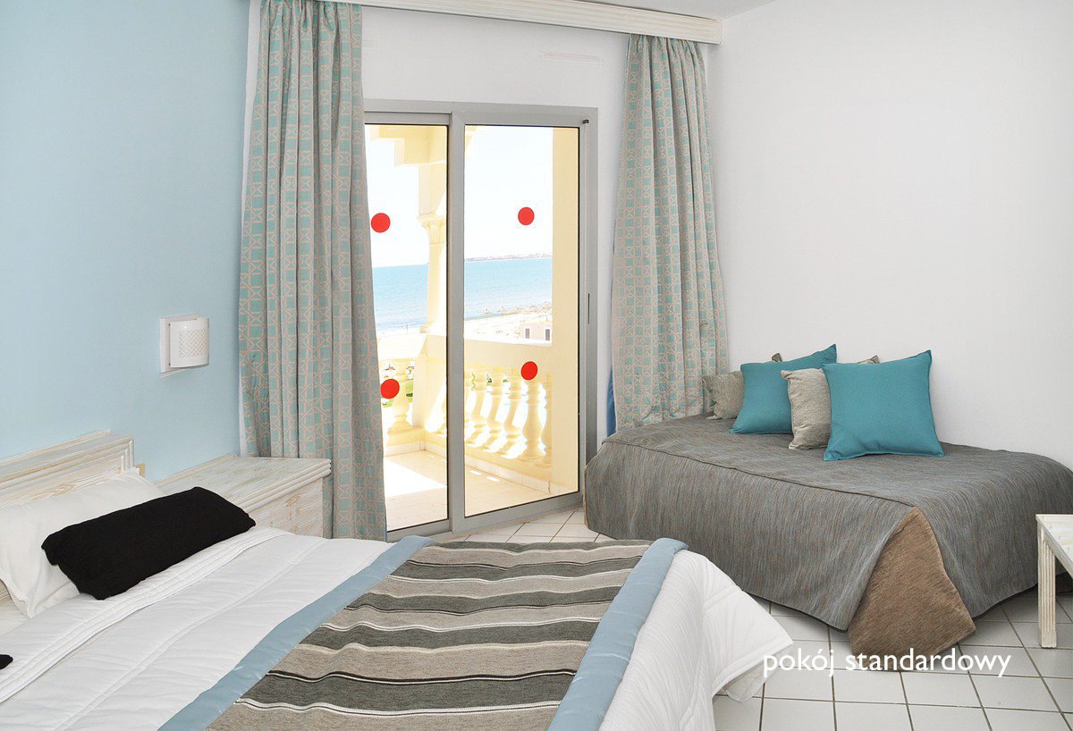 standardowy: 2-os. (możliwość 1 dostawki dla os. dorosłej lub 2 dostawek dla dzieci - łóżko piętrowe), ok. 22-24 m², klimatyzowany (w terminie: 15.06-15.09), łazienka (wanna, wc; suszarka), telewizja satelitarna, telefon, internet bezprzewodowy, minibar (woda i napoje bezalkoholowe uzupełnione przy przyjeździe), sejf (płatny: ok. 3 TND/dzień; depozyt: ok. 20 TND); bezpłatne łóżeczko dla dziecka do 2 lat na zamówienie przed przyjazdem; taras lub ogródek; widok na morze za dopłatą; rodzinny: 2-os. (możliwość 2 dostawek dla os. dorosłych lub 2 dzieci), ok. 40 m², wyposażenie jak w pokoju standardowym.