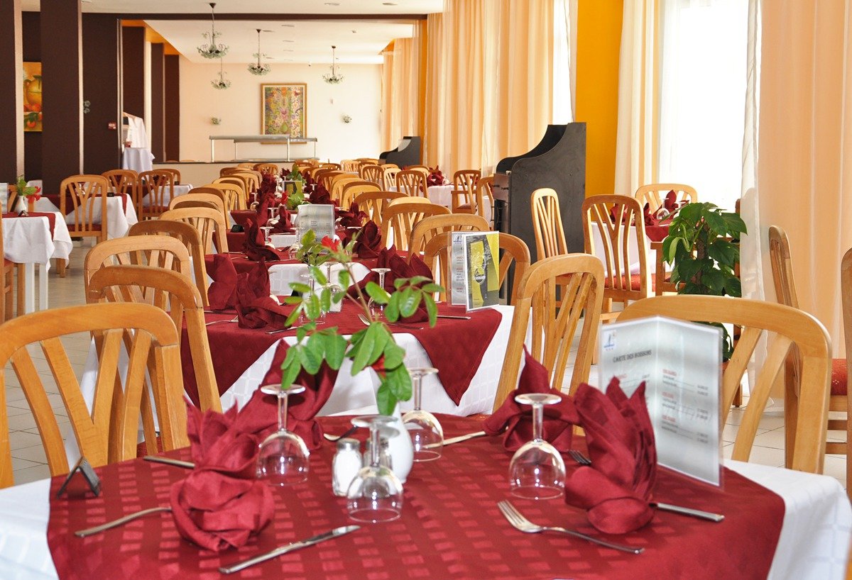 śniadanie (7.00-10.00), obiad (12.30-14.30), kolacja (19.00-21.00) w formie bufetu w restauracji głównej, przekąski (11.00-17.00); lokalne napoje bezalkoholowe i alkoholowe w barach.