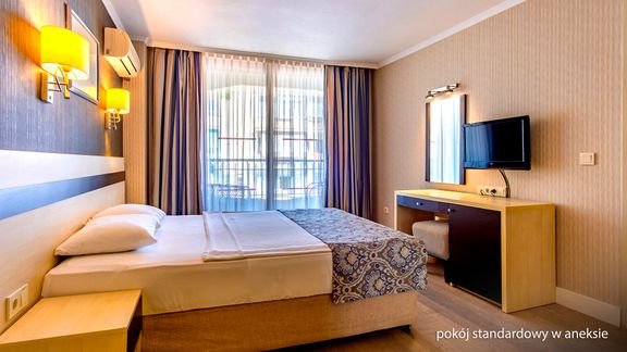 Świetna propozycja na rodzinne wakacje! Dzieciaki nie znajdą tu nudy – na miejscu jest miniklub, animacje oraz basen z 3 zjeżdżalniami, w których najmłodsi najchętniej spędzają czas. Goście doceniają lokalizację – tuż przy hotelu rozciąga się piękna plaża z bezpłatnym serwisem, na której można oddać się beztroskiemu relaksowi. Warto udać się do hotelowego centrum spa, by odprężyć się w saunie lub dla spragnionych aktywności fizycznej – poćwiczyć na siłowni. Całość dopełnia popularna i lubiana formuła all inclusive.