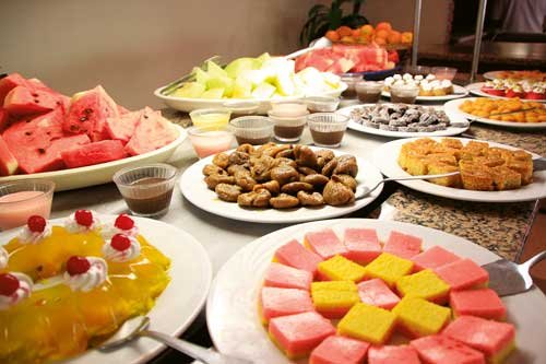 śniadanie (7.30-10.00), późne śniadanie (10.00-10.30), obiad (12.00-14.00), kolacja (19.00-21.00), przekąski (11.00-16.00), kawa, herbata i ciastko (16.00-17.00), nielimitowana ilość napojów bezalkoholowych i lokalnych alkoholi (10.00-24.00); wymagane noszenie opasek all inclusive.