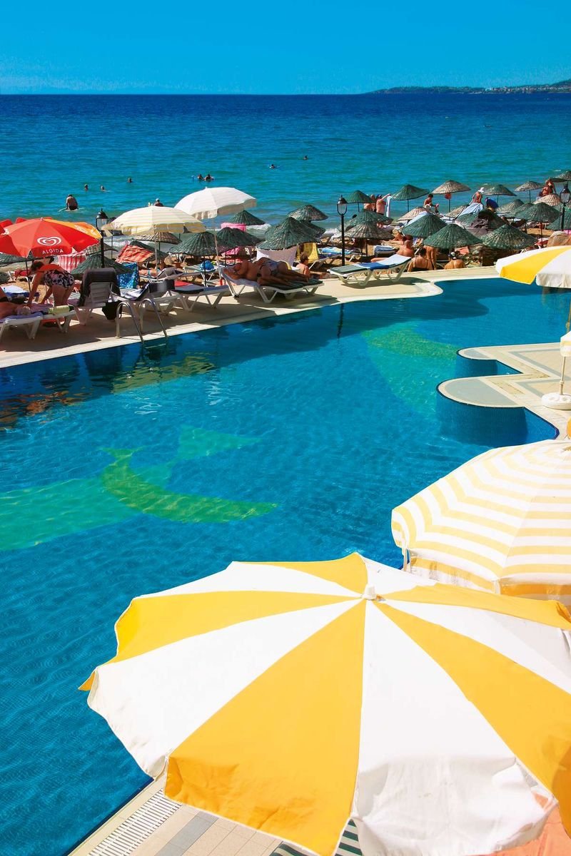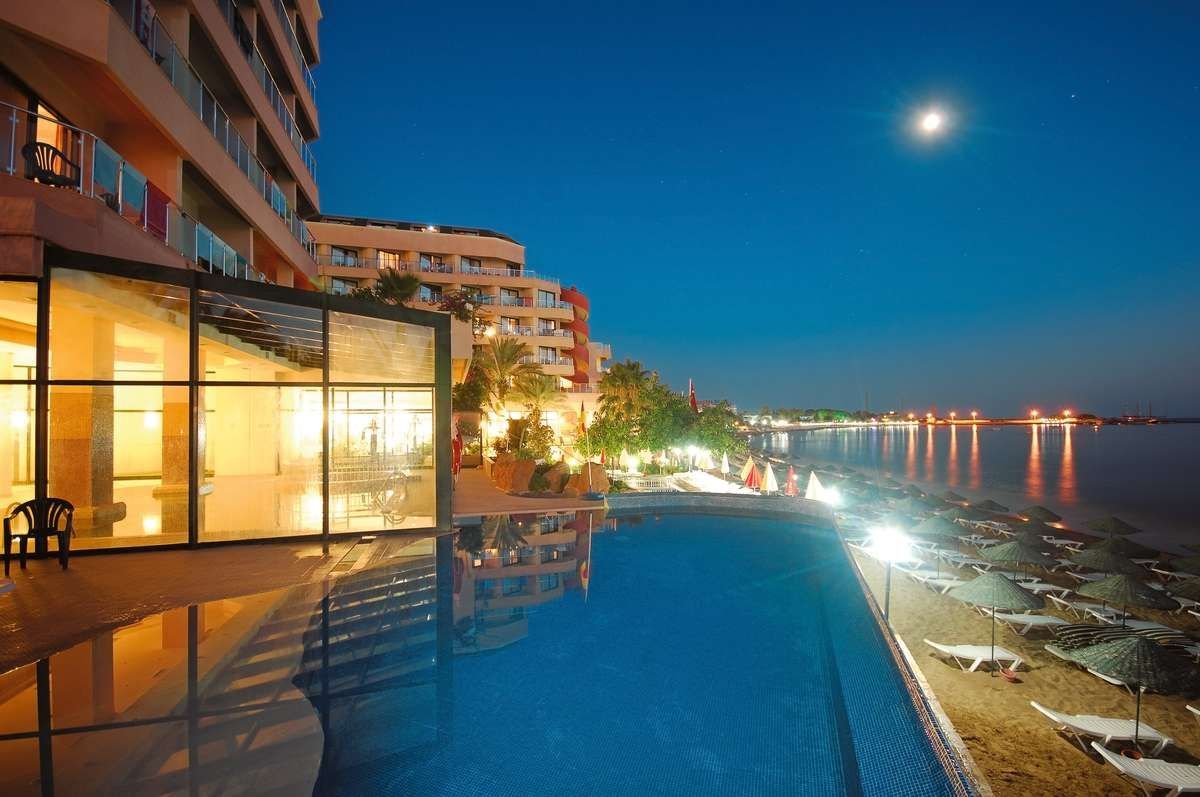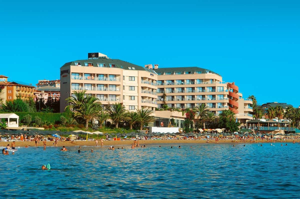Jedyny w swoim rodzaju, rewelacyjnie położony na samej plaży, idealnie nadaje się na romantyczne wakacje we dwoje. Należący do sieci hoteli Aska, z roku na rok zyskuje coraz bardziej przychylne opinie swoich Klientów. Znany wcześniej jako hotel Justiniano Beach, w 2009 r. otrzymał 5. gwiazdkę. Obiekt składa się z trzech budynków, ale naszym Klientom specjalnie oferujemy tylko pokoje z widokiem na morze w dwóch budynkach położonych na samej plaży. Hotel oferuje program all inclusive przez 24 godziny na dobę!