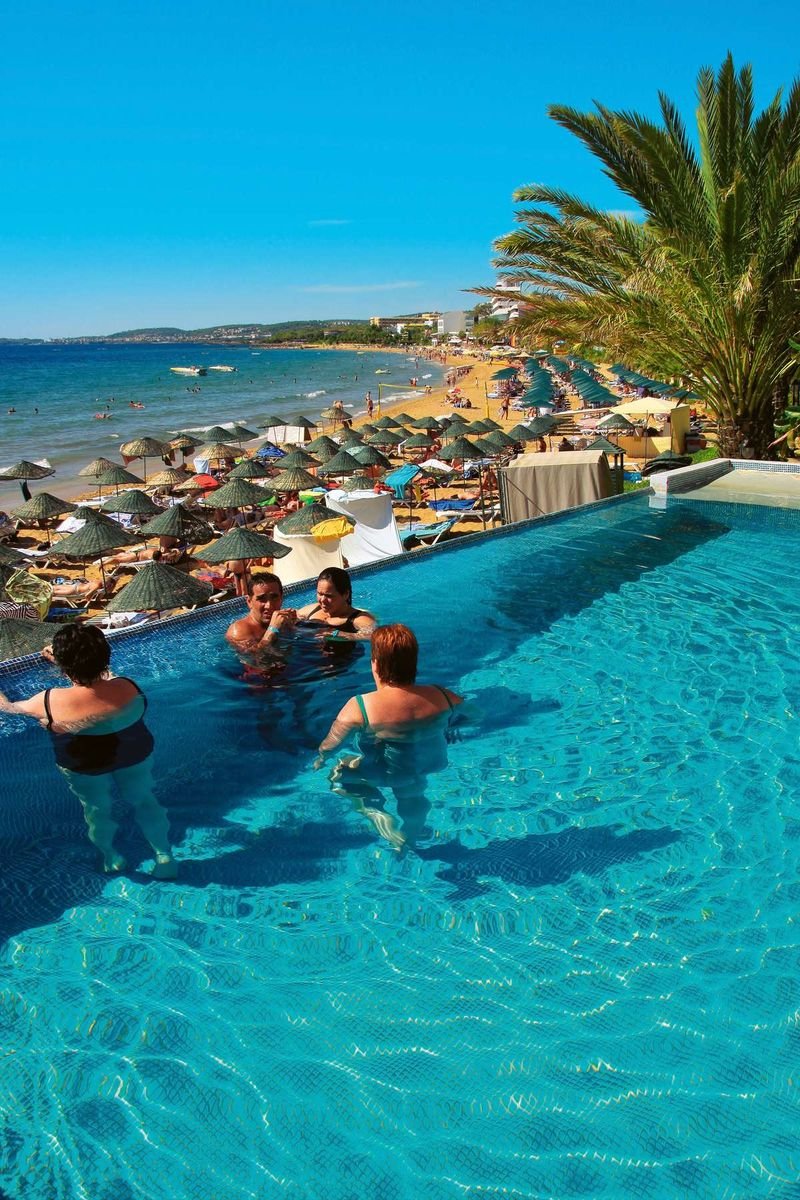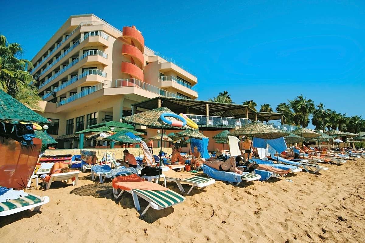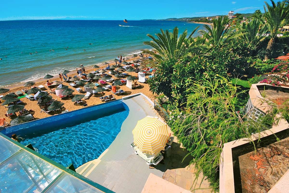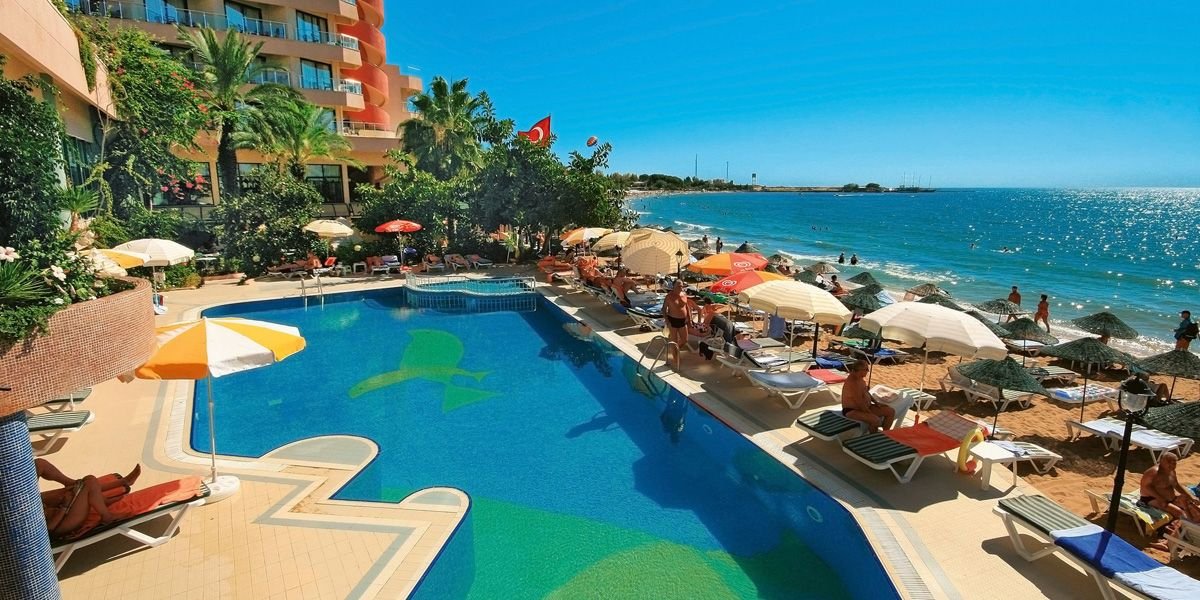 Jedyny w swoim rodzaju, rewelacyjnie położony na samej plaży, idealnie nadaje się na romantyczne wakacje we dwoje. Należący do sieci hoteli Aska, z roku na rok zyskuje coraz bardziej przychylne opinie swoich Klientów. Znany wcześniej jako hotel Justiniano Beach, w 2009 r. otrzymał 5. gwiazdkę. Obiekt składa się z trzech budynków, ale naszym Klientom specjalnie oferujemy tylko pokoje z widokiem na morze w dwóch budynkach położonych na samej plaży. Hotel oferuje program all inclusive przez 24 godziny na dobę!