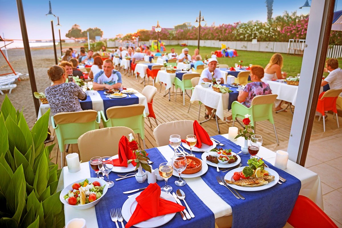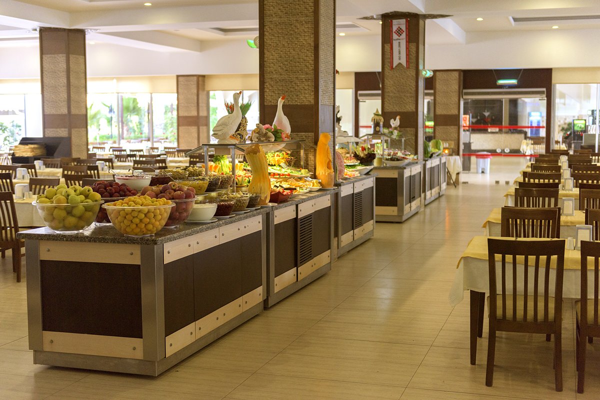 śniadanie (7.00-10.00), późne śniadanie (10.00-10.30), obiad (12.30-14.00), kolacja (19.00-21.00) w formie bufetu w restauracji głównej, raz na tydzień kolacja w restauracji à la carte (wymagana wcześniejsza rezerwacja); przekąski (10.30-23.00) w barach; nocna zupa (23.00-24.00) w restauracji głównej; lokalne napoje bezalkoholowe i alkoholowe (10.30-23.00) w barach; wymagane noszenie opasek all inclusive.