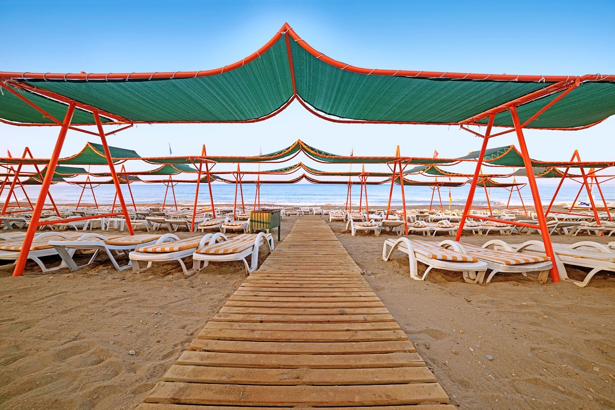 hotelowa, piaszczysto-żwirkowa, łagodne zejście do morza, ok. 80 m od hotelu, przejście podziemne pod ulicą, bezpłatne parasole, leżaki i materace, ręczniki za kaucją; bar objęty formułą all inclusive.