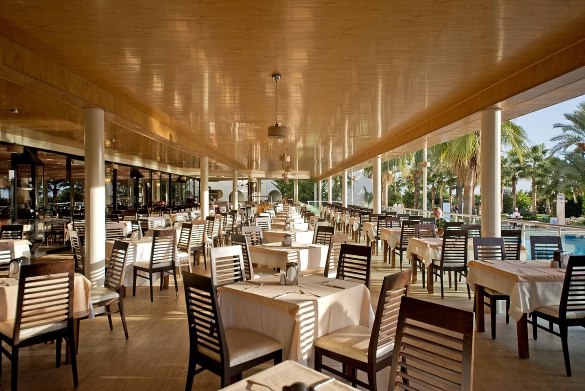 śniadanie (7.00–10.00), późne śniadanie (10.00-10.30), obiad (12.30-14.00), kolacja (19.00-21.00) w formie bufetu w restauracji głównej, raz na pobyt kolacja w restauracji à la carte (wymagana wcześniejsza rezerwacja); placki gozleme (11.00-16.00), przekąski i świeże owoce (11.00-16.30), słodkie przekąski (13.30-16.30), lody (15.00-16.00), kawa i herbata (16.30-17.30), nocne przekąski (23.00-6.30); napoje bezalkoholowe, lokalne i wybrane importowane napoje alkoholowe (10.00-22.00) w wyznaczonych barach, lokalne napoje alkoholowe i bezalkoholowe (22.00-6.00) w wyznaczonym barze, wymagane noszenie opasek all inclusive