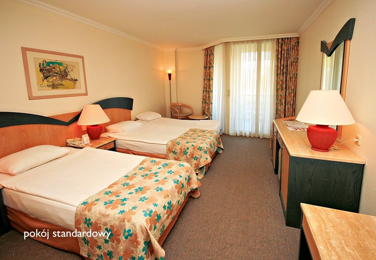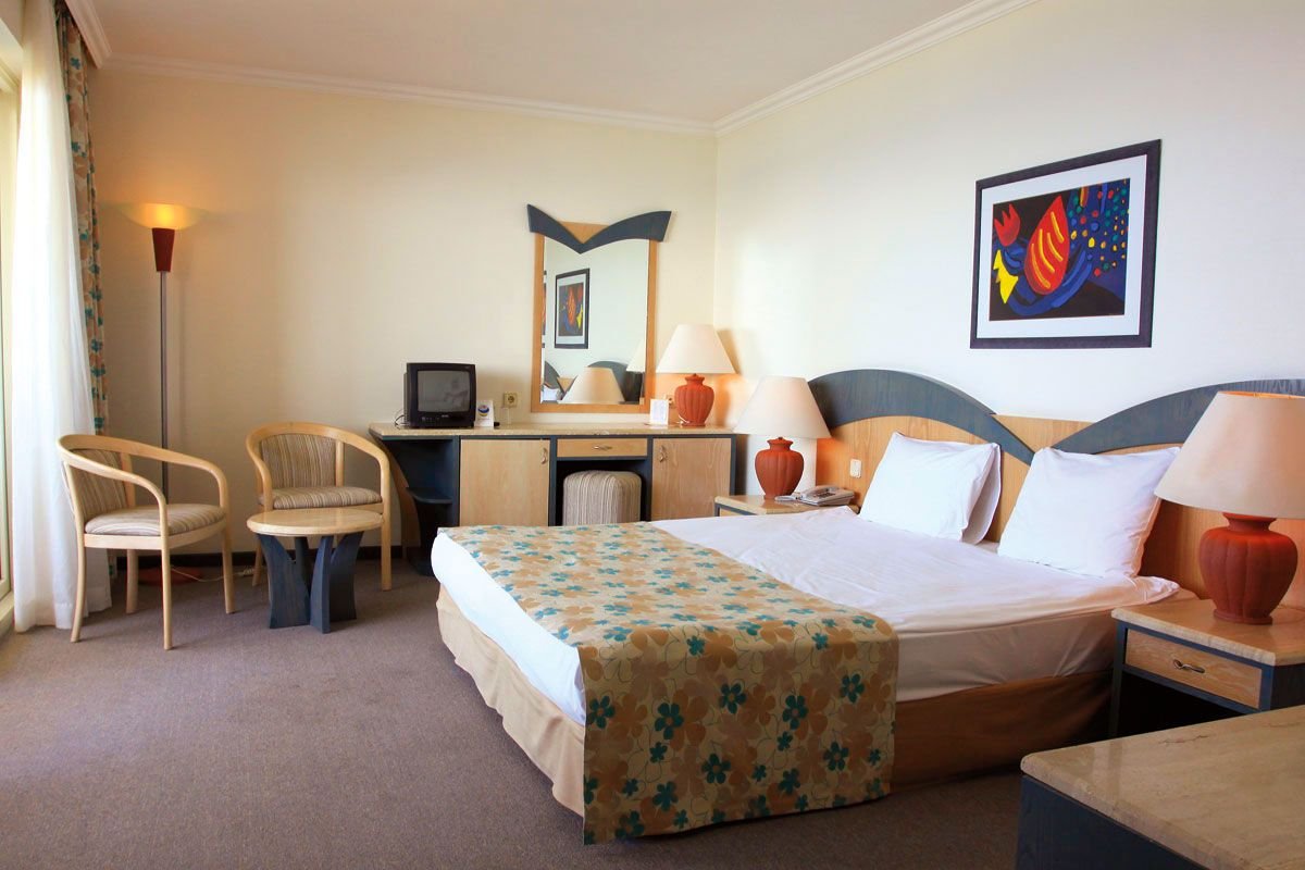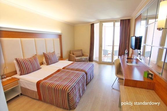 standardowy: (głównie Pegasos Resort): 2-os. (możliwość 1 dostawki dla osoby dorosłej lub 2 dostawek dla dzieci), ok. 25 m², klimatyzowany, łazienka (wanna lub prysznic, wc; suszarka), telewizja satelitarna, telefon; za opłatą: sejf, minibar; bezpłatne łóżeczko dla dziecka do 2 lat na zamówienie przed przyjazdem; balkon (stolik i krzesełka); rodzinny: (głównie Pegasos Royal): 2-os. (możliwość 1 lub 2 dostawek), ok. 31 m², wyposażenie jak w pokoju standardowym, duży pokój przedzielony przesuwanymi drzwiami lub dwa osobne pomieszczenia; pokój rodzinny za dopłatą.