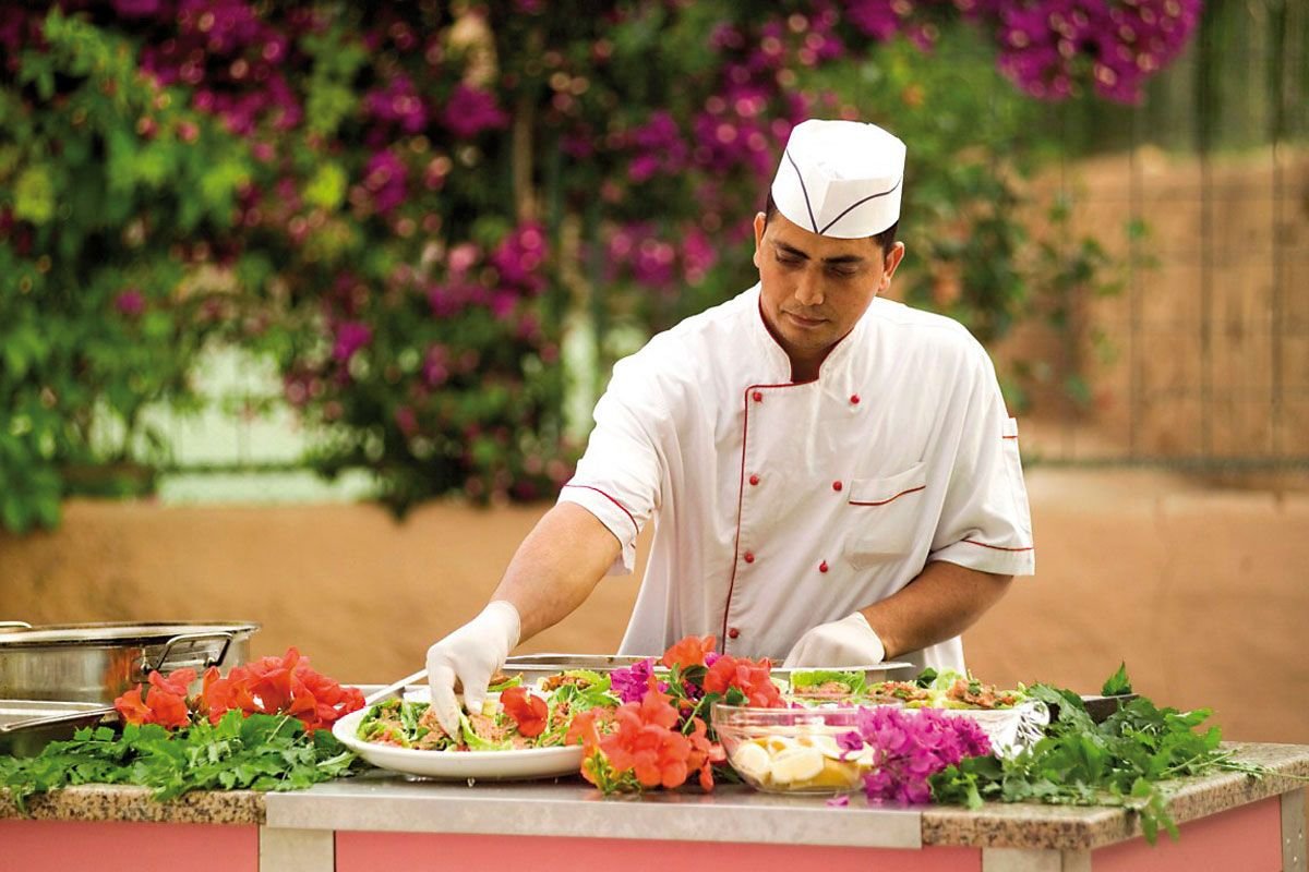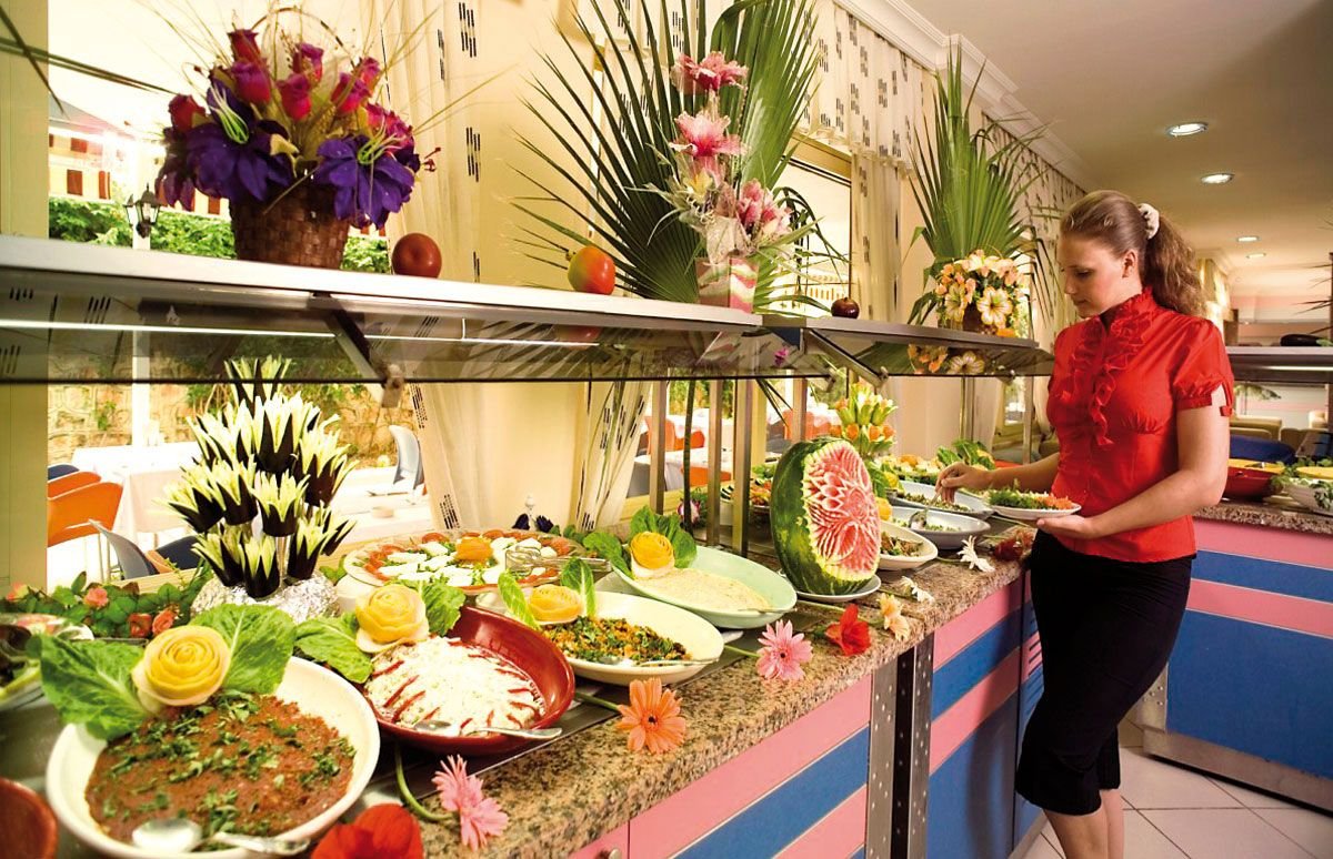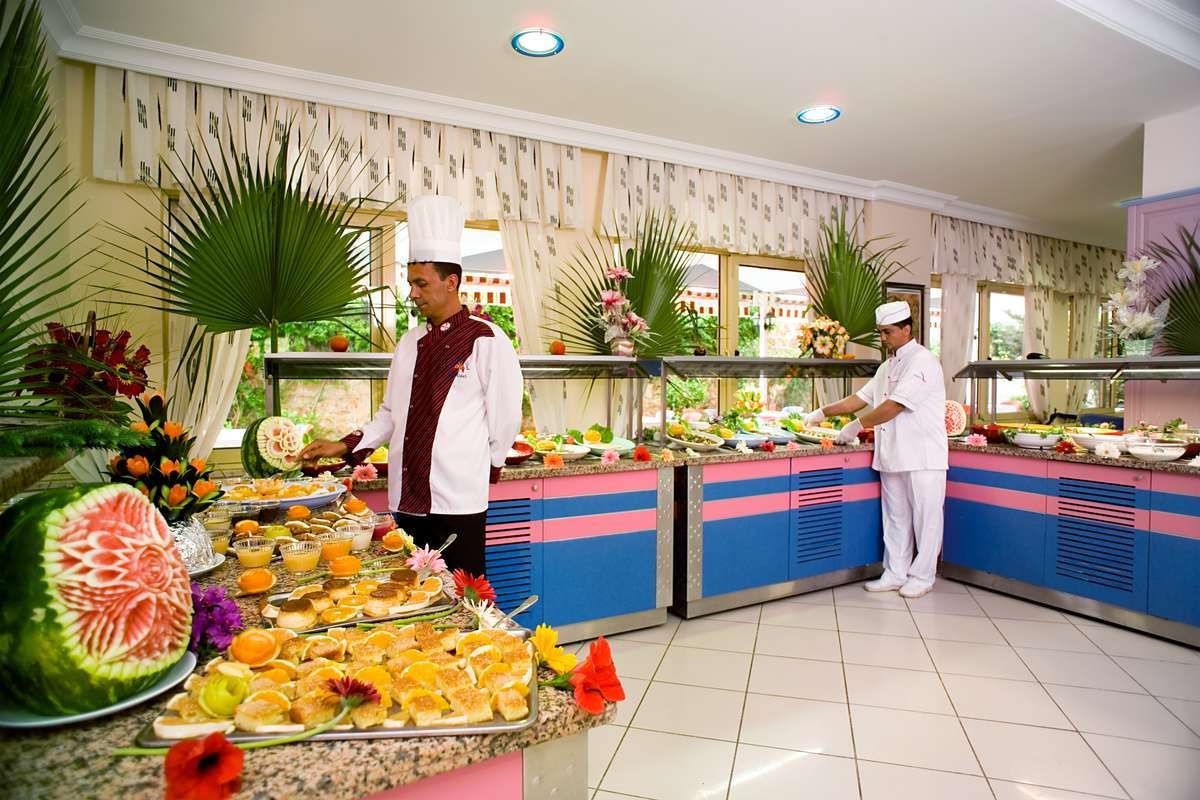 śniadanie (7.30-10.00), obiad (12.00-13.30), kolacja (19.00-21.00) w restauracji; napoje bezalkoholowe i lokalne napoje alkoholowe w barze przy basenie (10.00-23.00); wymagane noszenie opasek all inclusive.