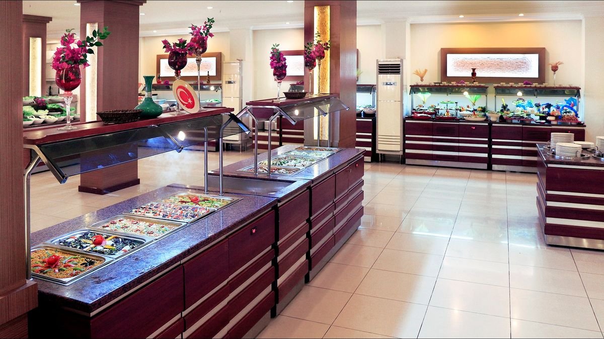 śniadanie (07.30-10.00), późne śniadanie (10.00-10.30), obiad (12.30-14.00) i kolacja (19.00-21.00) w formie bufetu w restauracji głównej; przekąski w barze na plaży (11.30-16.00), kawa, ciasto w cukierni (11.30-17.00), przekąski w snack barze (14.30 – 16.00); nocna zupa (23.30-00.00) i przekąski (23.30-07.30) w restauracji głównej; lokalne napoje bezalkoholowe i alkoholowe całodobowo w wyznaczonych barach; raz na pobyt kolacja w restuaracji à la carte (wymagana wcześniejsza rezerwacja); wymagane noszenie opasek all inclusive.