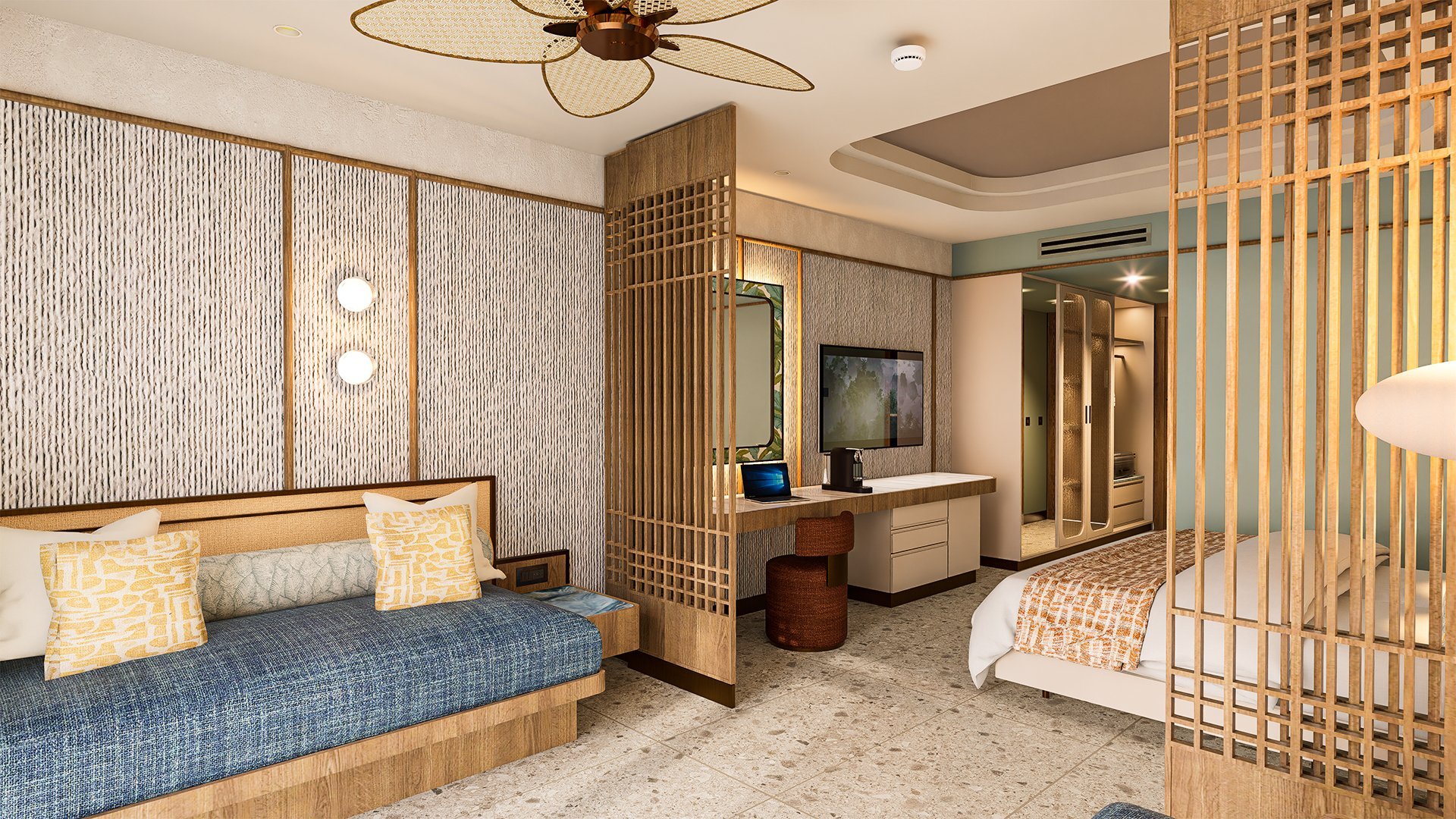 Stylowy, pachnący nowością, zachwyca połączeniem elegancji, komfortu i swobodnej wakacyjnej atmosfery. Każdy zakątek hotelu – od przestronnych, nowocześnie urządzonych pokoi, po luksusowe spa, został zaprojektowany tak, by Goście czuli się tu wyjątkowo. Restauracje rozpieszczają podniebienia różnorodnym menu, serwując zarówno lekkie przekąski, jak i wykwintne dania, a ulubionym miejscem do relaksu są ładnie zaaranżowane baseny otoczone ogrodem i leżakami. Miłośnicy plażowania mogą odwiedzić pobliską hotelową plażę, by poopalać się i popływać w morzu, na najmłodszych z kolei czekają zajęcia z animatorami, zabawa w mini i teen clubie i coś, co spodoba się im najbardziej, czyli basen z 4 zjeżdżalniami. Prezentowany materiał graficzny przedstawia wizualizację obiektu.