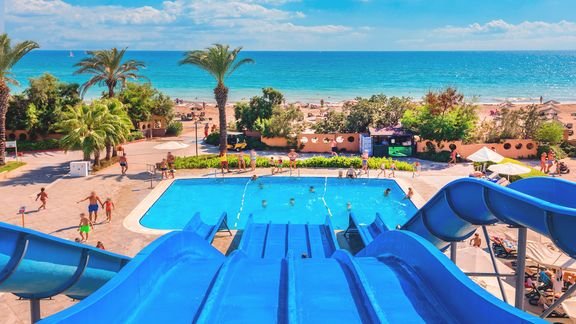 •11 basenów, w tym baseny dla dzieci, basen dla osób powyżej 16. roku życia oraz basen kryty, słodka woda•aquapark, 7 zjeżdżalni