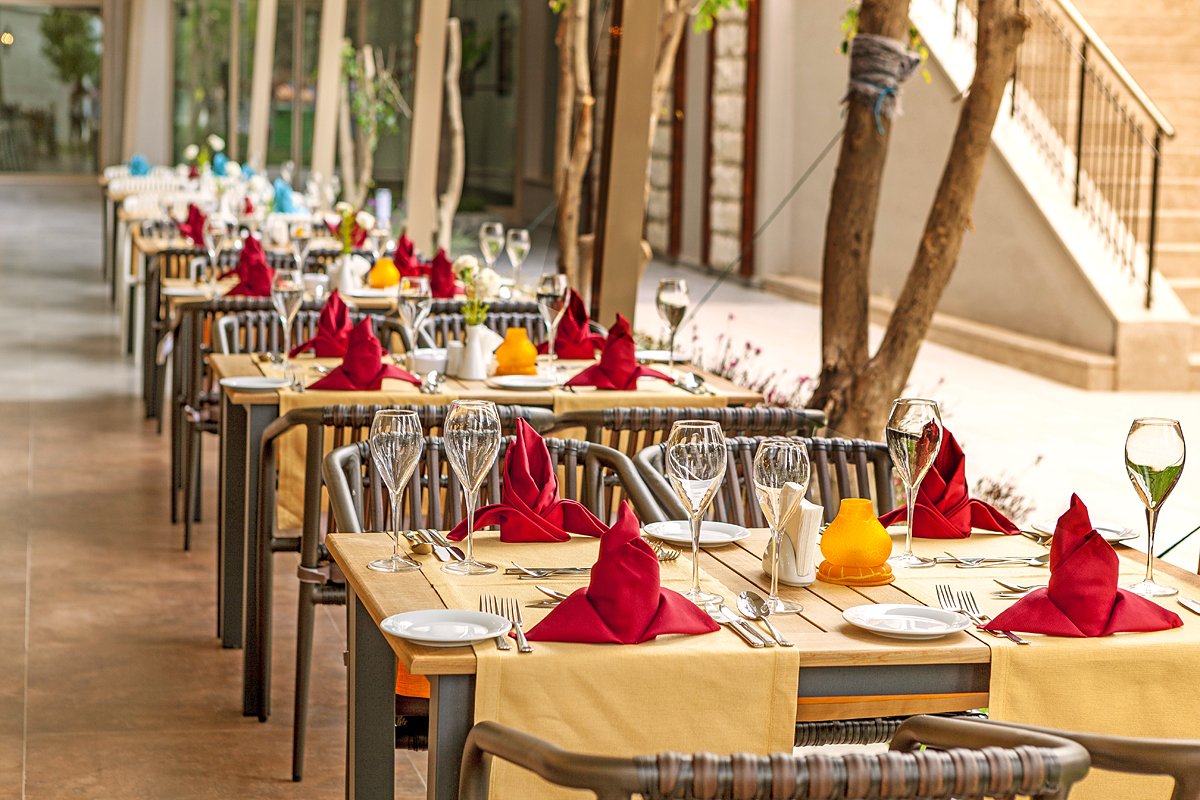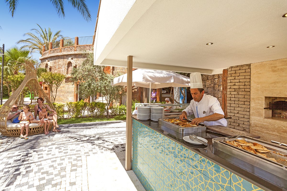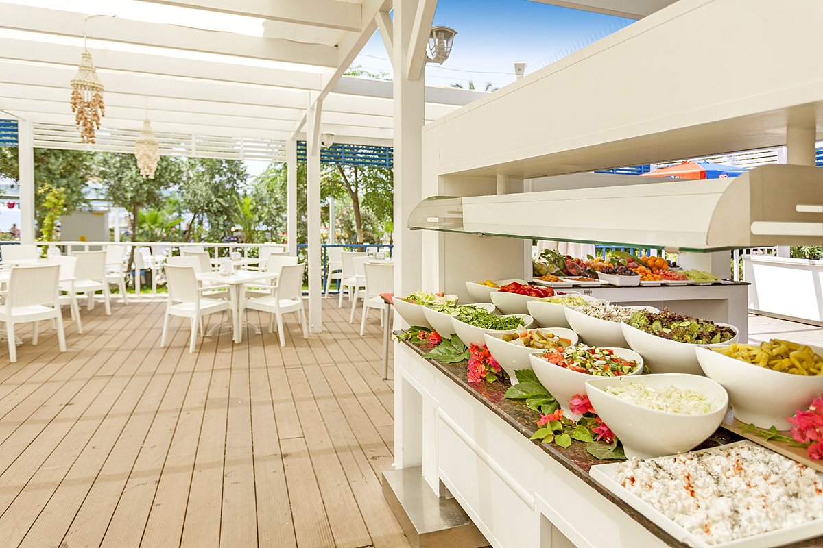 śniadanie (7.00-10.00), późne śniadanie (10.00-11.30), obiad (12.30-14.00), kolacja (18.30-21.00) w formie bufetu w restauracji głównej; przekąski (12.00-16.00) w snack barze, nocne przekąski (24.00-7.00); lokalne napoje bezalkoholowe i alkoholowe oraz wybrane alkohole importowane (24h) w wyznaczonych barach; wymagane noszenie opasek all inclusive.